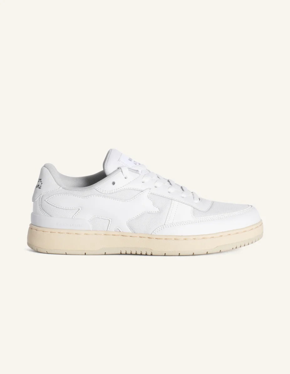 DETAILS Chiru trainers in canvas and leather. - Low-top sneakers in smooth leather, suede leather and canvas - Lace-up closure - Tonal leather Profile Fox topstitched on the sides - Maison Kitsune Handwriting signature embossed at the back - Woven Maison Kitsune Paris label on the tongue - Upper in leather and cotton canvas - Molded rubber outsole with signature Profile Fox - EVA sole MM04804OF0004-P181 SIZE & CUT Sizing: MEN The male model is 6 tall and wears a size S MATERIAL Lining: 40% VINYL ETHYLENE ACETATE, 50% POLYESTER, 10% POLYURETHANE, Upper: 55% BOVINE LEATHER, 40% COTTON, 5% CALF LEATHER, Outsole: 98% RUBBER, 2% THERMOPLASTIC POLYURETHANE, Insole: 40% VINYL ETHYLENE ACETATE, 50% POLYESTER, 10% POLYURETHANE TRACEABILITY Made in China