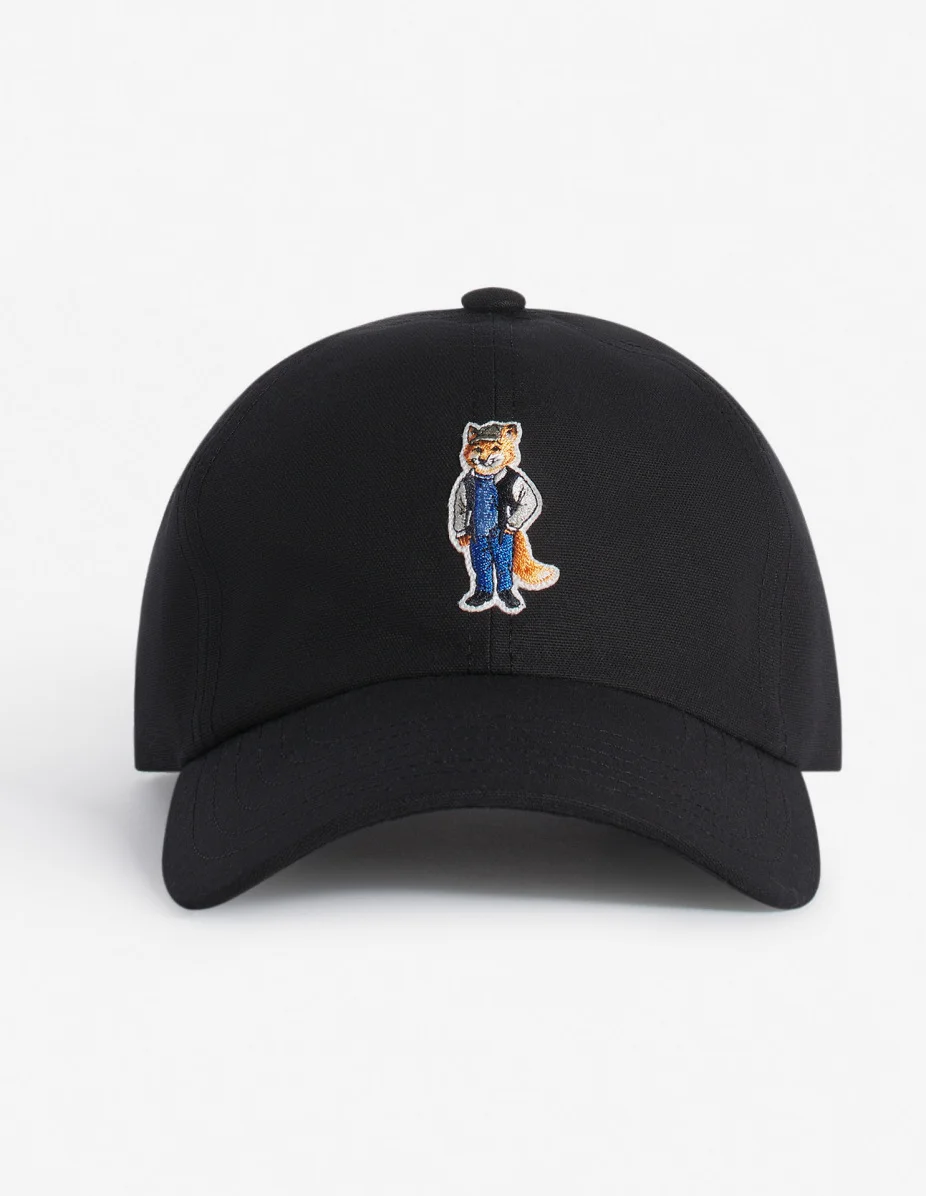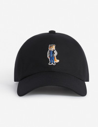 DETAILS Organic cotton canvas cap, embroidered Dressed Fox patch. - Organic cotton canvas cap: natural irregularities inherent in organic fibers may be visible - Six-panel cap - Curved brim - Dressed Fox embroidered patch at the front - Adjustable metal buckle at the back with Maison Kitsune and Profile fox engravings - Maison Kitsune Handwriting signature embroidered at the back PM06101WB0026-P199 SIZE & CUT Sizing: UNISEX MATERIAL 100% COTTON TRACEABILITY Made in Bulgaria