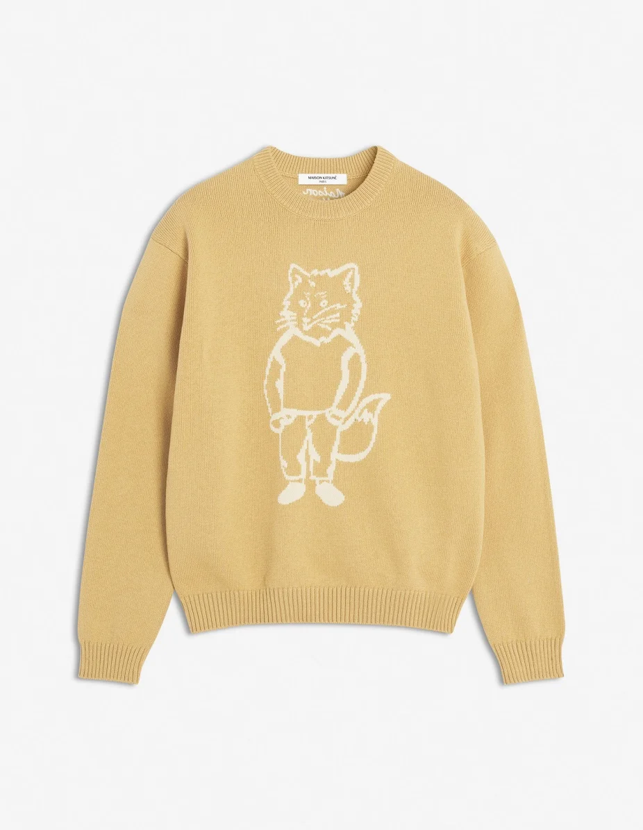 DETAILS Long sleeve knit jumper. Comfort cut with Easy Fox and Maison Kitsune Handwriting signature in intarsia. - Knit jumper - Comfort cut - Crewneck - Easy Fox in intarsia on the front - Long sleeves - Maison Kitsune Handwriting signature in intarsia on the back - Ribbing at the neckline, cuffs, and waist OM00802KT1030-0102 SIZE & CUT Cut: COMFORT Sizing: MEN The male model is 9 and is wearing size M MATERIAL 70% COTTON, 30% POLYAMIDE TRACEABILITY Made in China