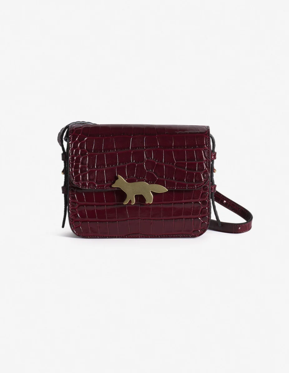 DETAILS Edie bag with adjustable shoulder strap in crocodile-embossed leather, metal Profile fox clasp. - Edie bag in textured embossed leather - Can be worn crossbody or on the shoulder - Flap with gold-tone Profile Fox latch clasp - Adjustable shoulder strap with buckle, loops and collar buttons - Three interior compartments - Interior leather patch pockets and card holder - Gold embossed Maison Kitsune logo at the back - Twill lining - Dimensions: 20 x 16 x 5.5 cm - Clean with a soft cloth NW05170LR0045-0143 SIZE & CUT Sizing: UNISEX MATERIAL Main Material: 100% BOVINE LEATHER, Lining: 100% COTTON TRACEABILITY Made in Tunisia