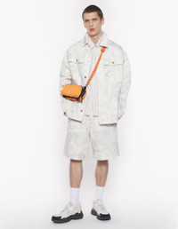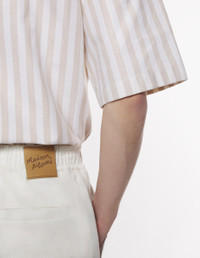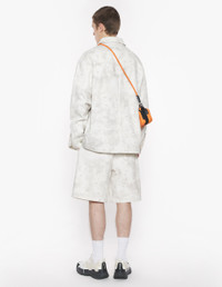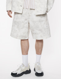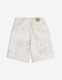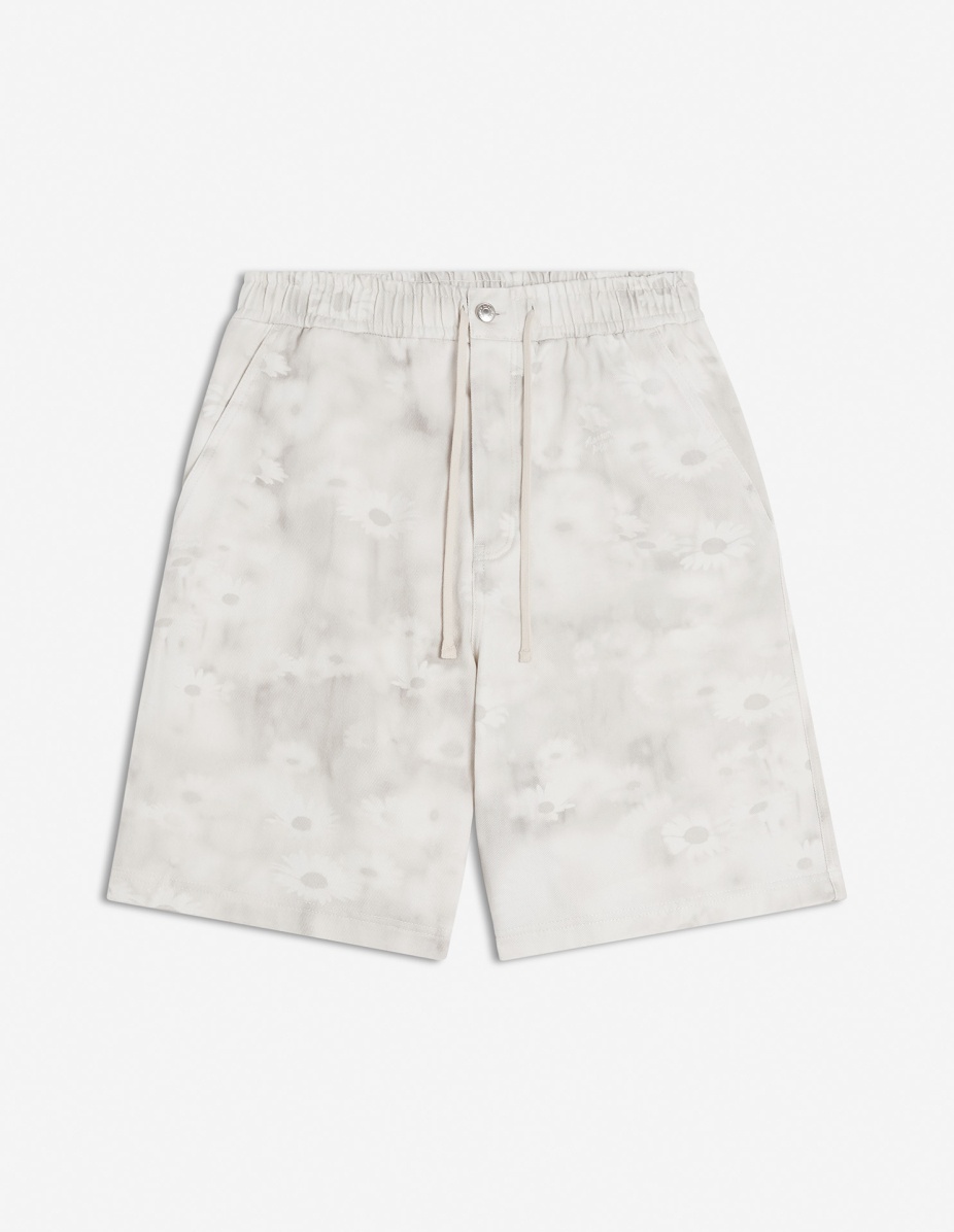DETAILS Denim Photographic Daisy Field print Bermuda shorts. Relaxed cut with Maison Kitsune embossed leather jacron. - Denim Photographic Daisy Field print Bermuda shorts - Relaxed cut - Elasticated drawstring waist - Engraved metal button closure with hidden zipper - Two side slash pockets - Maison Kitsune embossed leather jacron at the back - Two welt back pockets - Maison Kitsune Handwriting signature integrated into the print OM01410WW9051-0226 SIZE & CUT Cut: RELAXED Sizing: MEN The male model is 11 and is wearing size M MATERIAL Main Material: 100% COTTON, Pocket lining: 35% COTTON, 65% POLYESTER TRACEABILITY Made in Italy