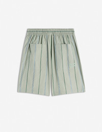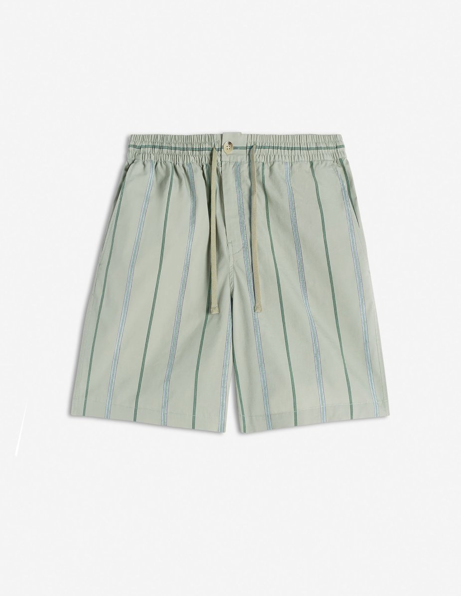 DETAILS Cotton poplin Heritage Stripe shorts. Comfort cut with Maison Kitsune Handwriting signature embroidered. - Striped cotton poplin Heritage Stripe shorts - Comfort cut - Elasticated drawstring waistband - Button closure with hidden zipper - Two side slash pockets - Two patch back pockets - Maison Kitsune Handwriting signature embroidered on the back pocket OM01407WC5029-0078 SIZE & CUT Cut: COMFORT Sizing: MEN The male model is 10 and is wearing size M MATERIAL 85% COTTON, 15% POLYAMIDE TRACEABILITY Made in Portugal