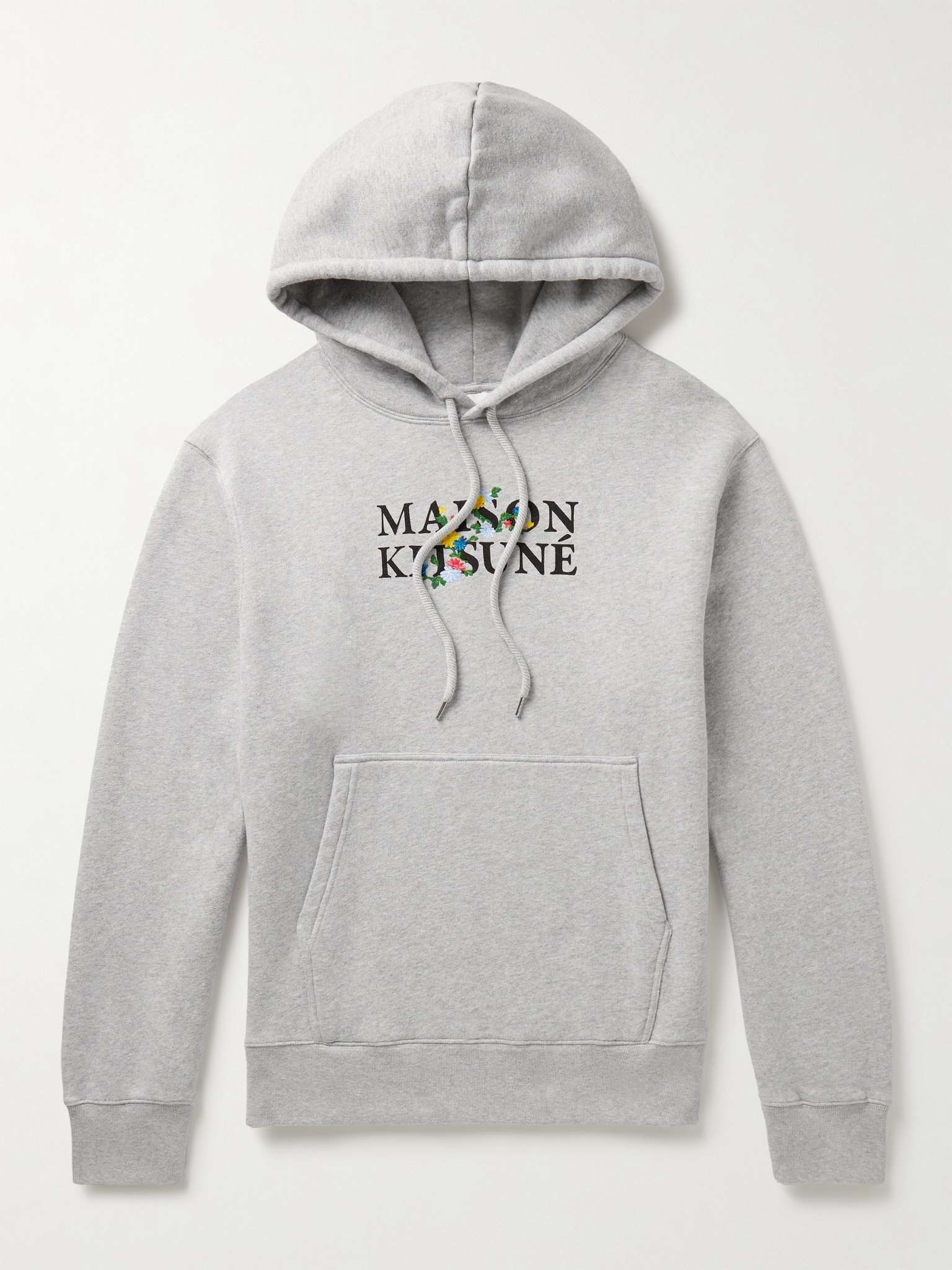 Maison Kitsuné's hoodie is embroidered with colourful flowers that wrap around the printed moniker. It's cut for a relaxed fit from cotton-jersey and backed in soft fleece. Size & Fit - Fits true to size. Take your normal size - Designed for a relaxed cut - Dropped shoulder seam - Mid-weight, slightly stretchy fabric - Model is shown wearing a M - Model measures: chest 38"/ 96cm, height 6'2"/ 188cm Details & Care - Grey mélange and black fleece-back cotton-jersey - 100% cotton - Machine wash