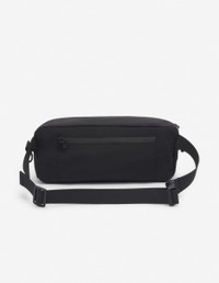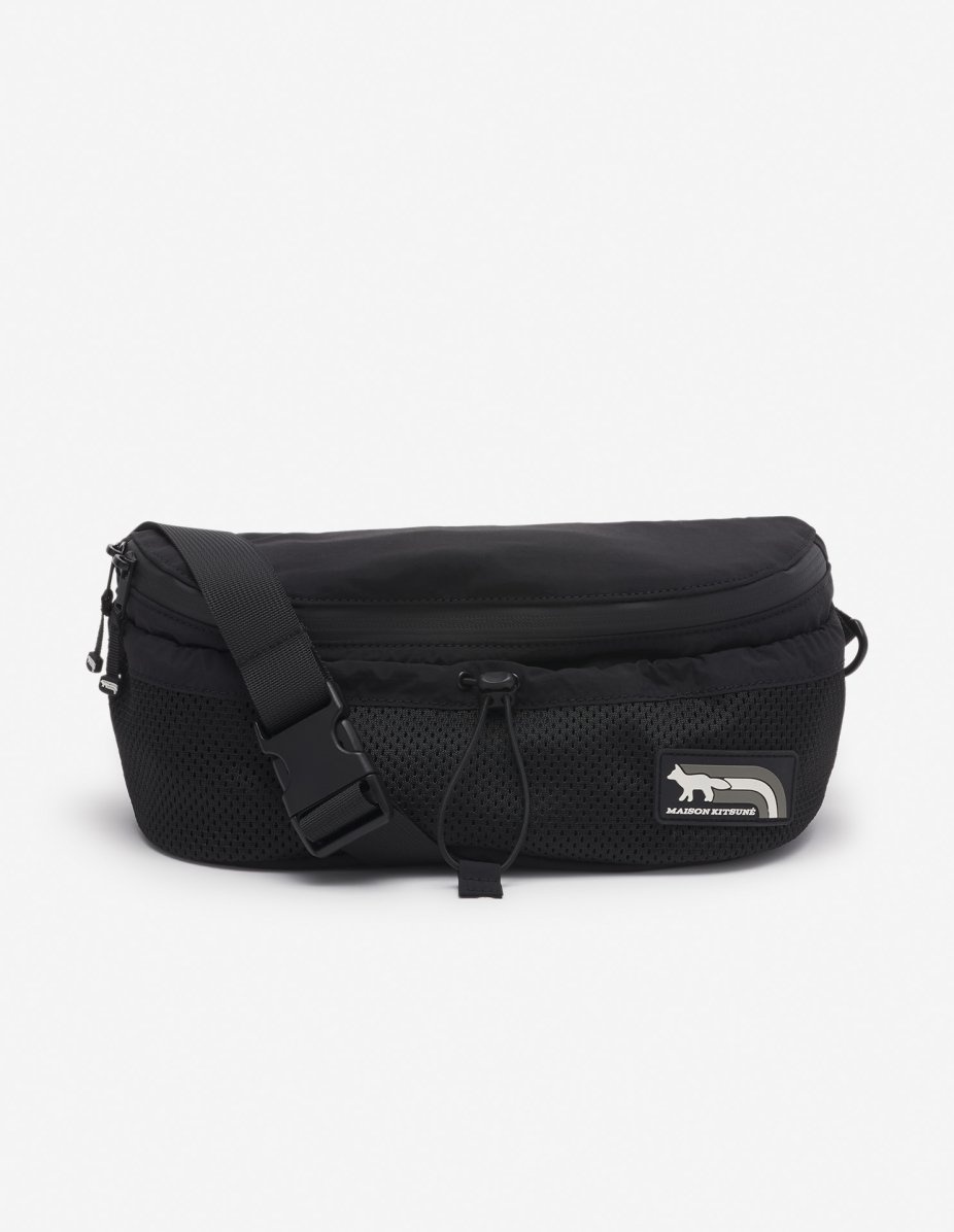 DETAILS Flash Fox nylon bumbag. - Flash Fox nylon bumbag - Crossbody wear - Adjustable woven belt with Profile Fox printed clip fastener - Mesh front pocket with elastic drawcord - Flash Fox silicone patch on the front - Zip pocket at the back - Double zip closure with Flash Fox sliders - Side tab with ring - Interior strap with carabiner hook - Interior pocket with snap and Maison Kitsune logo - Tone-on-tone lining - Dimensions: 13 x 28 cm NM05171WQ4034-P199 SIZE & CUT Sizing: MEN The female model is 5.7 and is wearing size S MATERIAL 100% NYLON TRACEABILITY Made in China