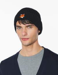 DETAILS Cotton beanie with Fox Head embroidered patch on the cuff. - Ribbed cotton knit beanie - Embroidered Fox Head patch on the cuff PM06111KT1140-P199 SIZE & CUT Sizing: UNISEX MATERIAL 100% COTTON TRACEABILITY Made in Morocco