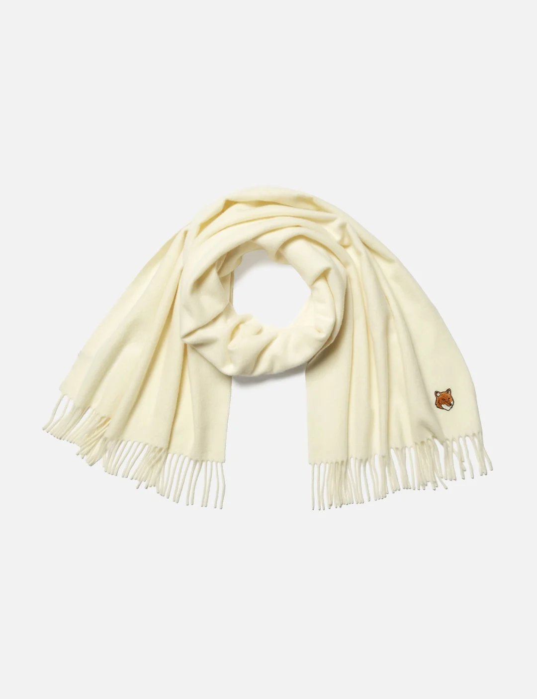- Maison Kitsune - Fox Head Scarf - Made of soft wool - Embroidered fox head patch at the hem - Logo label sewn on the interior - Fringed edges - Color: Paper - Material: 100% Virgin Wool - See more Scarves and Accessories - 60 × 202cm - Vendor Code: PM06201WB0044