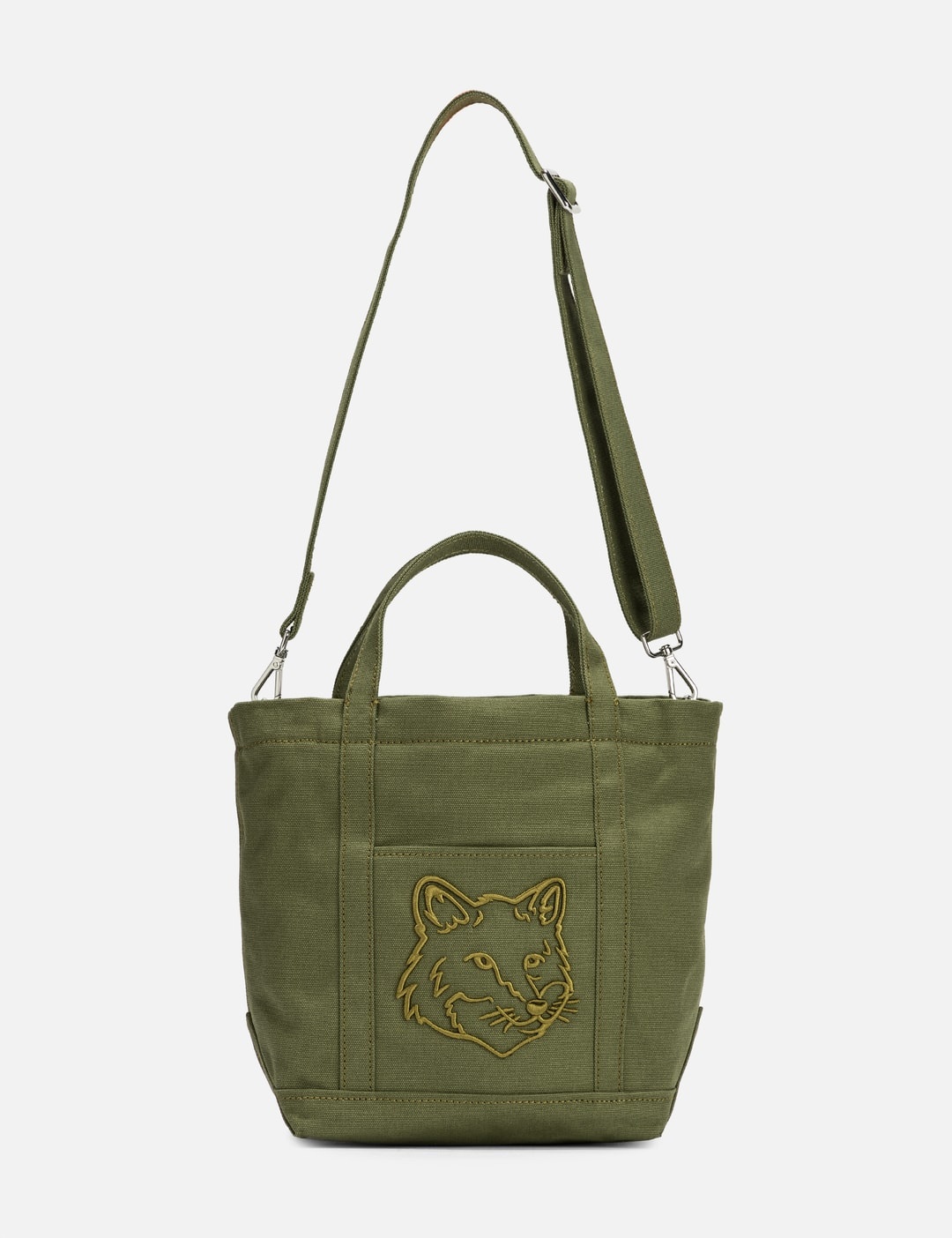 - Maison Kitsuné - Fox Head Small Tote - Durable canvas fabric - Zip closure - Detachable and adjustable shoulder strap - Embroidered Fox Head at front - Color: Military Green - Material: 100% Cotton - See more Bags and Accessories SIZING Approximate dimensions: - Height: 23cm - Width: 22cm - Depth: 12cm - Handle Length: 9cm - Strap Length: 37cm