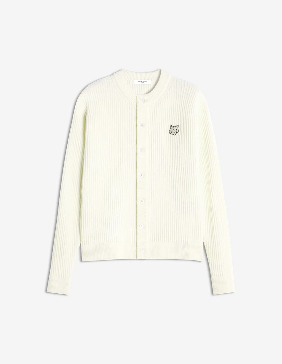 DETAILS Ribbed wool cardigan. Regular fit with Fox Head embroidered patch. - Ribbed wool cardigan - Regular fit - Crew neck - Maison Kitsune engraved button closure - Long sleeves - Rib finishing at the neckline, cuffs and hem - Ribbed knit - Tonal Fox Head embroidered patch on the chest PM00508KT1149-P700 SIZE & CUT Cut: REGULAR Sizing: MEN The male model is 6.2 and is wearing size M MATERIAL 100% WOOL TRACEABILITY Made in Italy