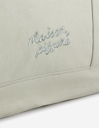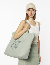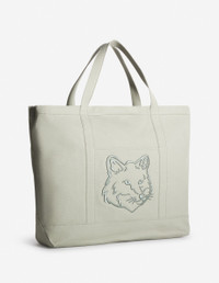 DETAILS XL Fox Head tote bag in heavy coated canvas. - XL tote bag in heavy coated plain canvas - Two large handles for hand and shoulder carry - Removable shoulder strap with engraved carabiner hooks and adjustable buckle - Front patch pocket with tone-on-tone Fox Head embroidery - Tone-on-tone Maison Kitsune Handwriting signature embroidered at the back - Zipper with engraved Profile Fox slider - Matching interior patch pocket with woven label with contrasted Maison Kitsune logo - Twill lining - Dimensions: 60 x 43.5 x 22 cm LW05105WW0107-0094 SIZE & CUT Sizing: UNISEX MATERIAL Exterior: 100% COTTON, Interior: 100% COTTON TRACEABILITY Made in China