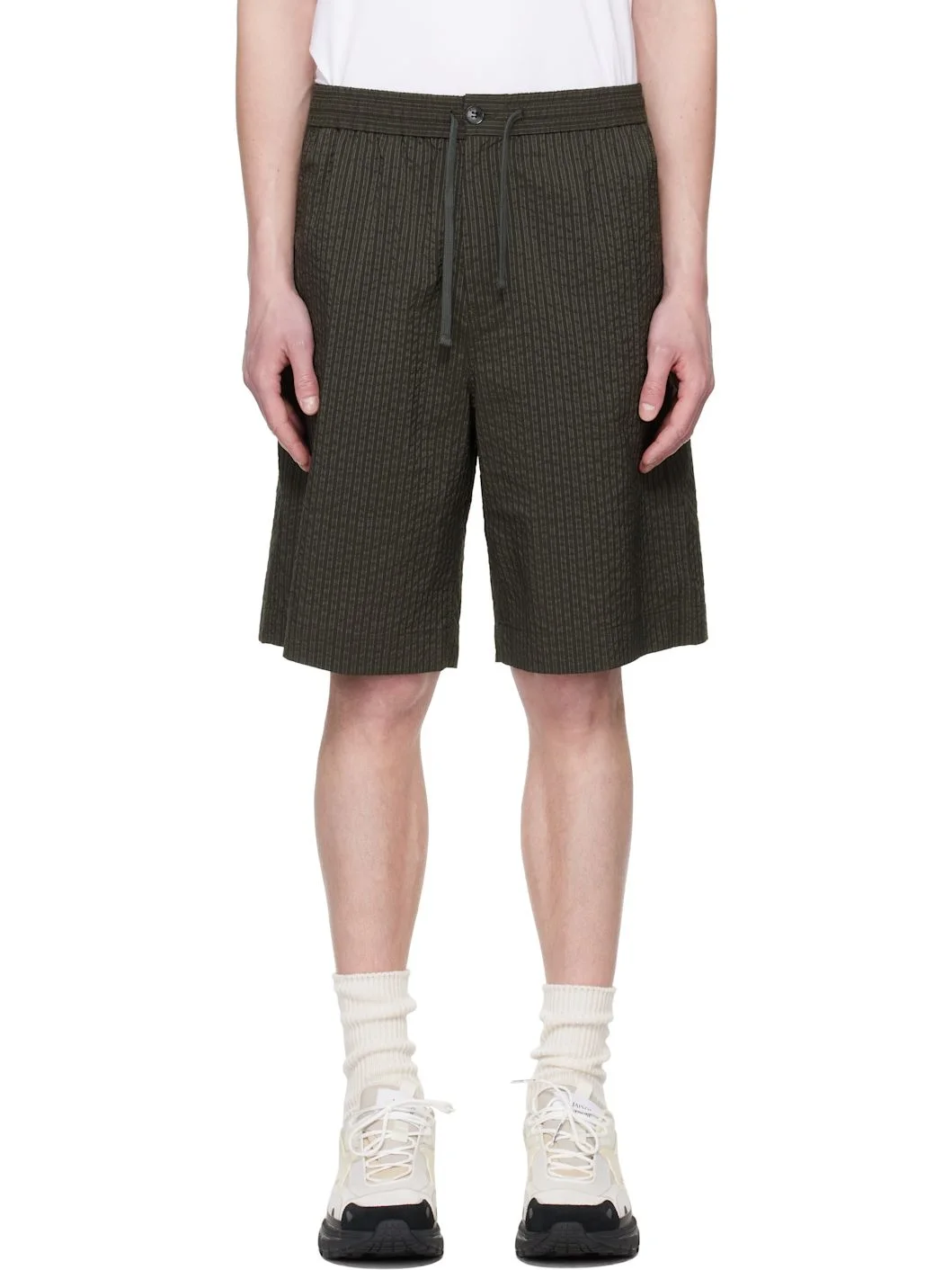 Loose-fit polyester- and cotton-blend seersucker shorts. Stripes throughout. · Drawstring at elasticized waistband · Four-pocket styling · Zip fly · Embroidered logo patch at back Supplier color: Ranger green Body: 74% polyester, 26% cotton. Lining: 100% cotton. Made in Romania 251389M193006