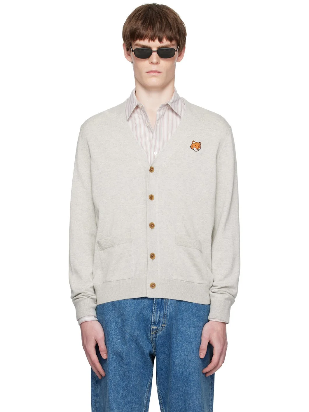 Knit wool cardigan. · Rib-knit Y-neck, hem, and cuffs · Button closure · Embroidered logo patch at chest · Patch pockets at front Supplier color: Light grey melange 100% wool. Made in Morocco 252389M200004