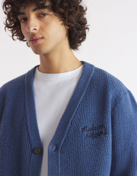 DETAILS Long sleeve super Geelong wool cardigan. Comfort fit with "Maison Kitsune Handwriting" signature embroidery on the chest. - Flecked super Geelong wool cardigan with ribbing - Comfort fit - V-neck - Closure with engraved horn buttons - Long sleeves - Ribbing at the neckline, cuffs, and waist - Embroidered contrast "Maison Kitsune Handwriting" signature on the chest MM00501KT1063-P433 SIZE & CUT Cut: COMFORT Sizing: MEN The male model is 6 and is wearing size M MATERIAL 100% WOOL TRACEABILITY Made in Bulgaria