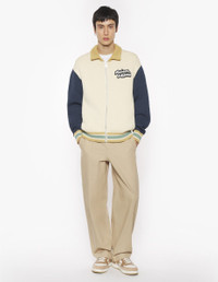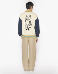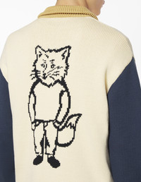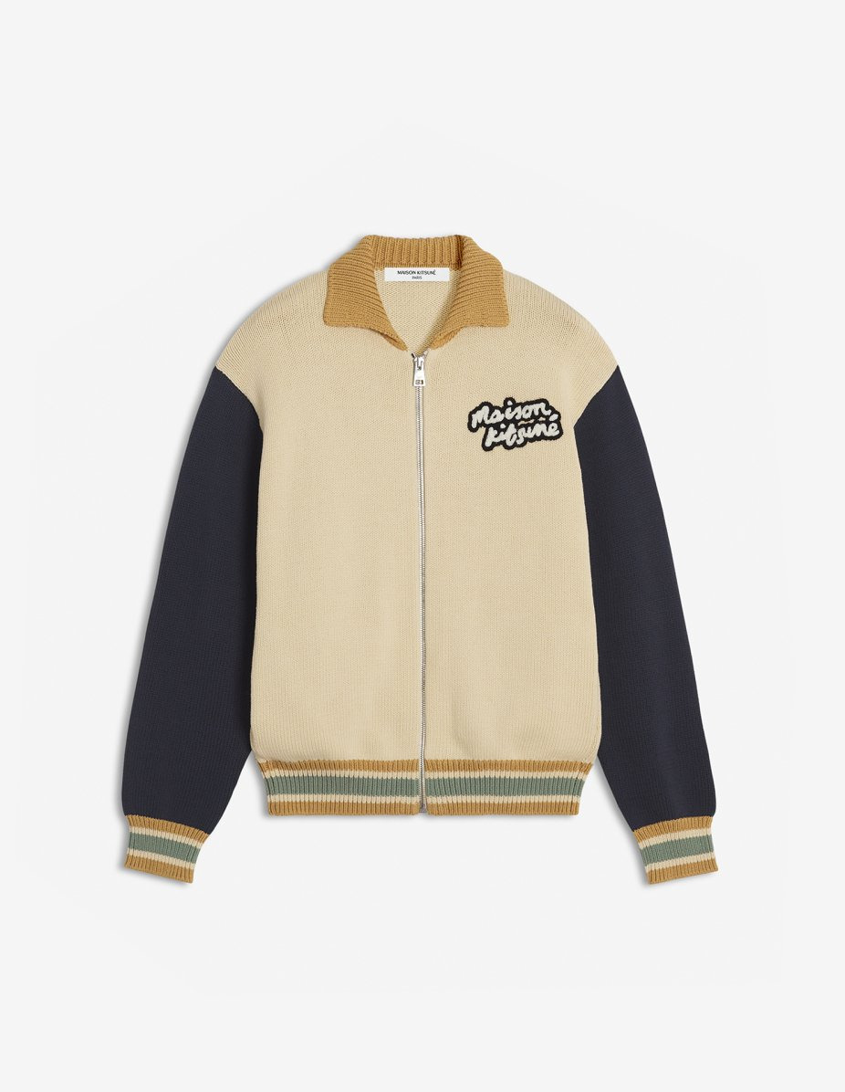 DETAILS Zipped knit College blouson. Comfort cut with embroidered Maison Kitsune Handwriting signature and Easy Fox in intarsia. - Zipped knit College blouson - Comfort cut - Zipper closure, engraved Profile Fox slider - Maison Kitsune Handwriting signature embroidered on the chest - Contrasted long sleeves - Two slash side pockets - Ribbing at the collar, cuffs, and waistband - Easy Fox in intarsia at the back OM02131KT1139-0256 SIZE & CUT Sizing: MEN The male model is 11 and is wearing size M MATERIAL 70% COTTON, 30% POLYAMIDE TRACEABILITY Made in China