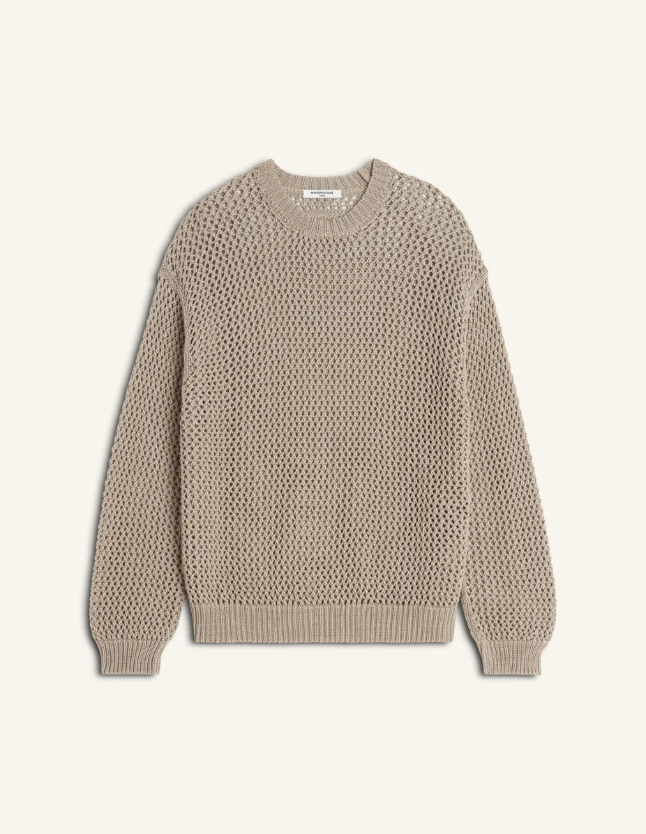 DETAILS Open-knit jumper in large pointelle cotton. Oversize fit with Maison Kitsune Paris tonal metal rivet at the back neckline. - Cotton open-knit jumper - Large chainette crochet stitch for a natural cord effect - Oversize fit - Crew neck - Ribbing at the neckline, cuffs, and bottom - Maison Kitsune Paris metal rivet at the back neckline QM00808KT1202-0430 SIZE & CUT Cut: OVERSIZE Sizing: MEN The male model is 6.1 tall and wears a size S MATERIAL 100% COTTON TRACEABILITY Made in Bulgaria