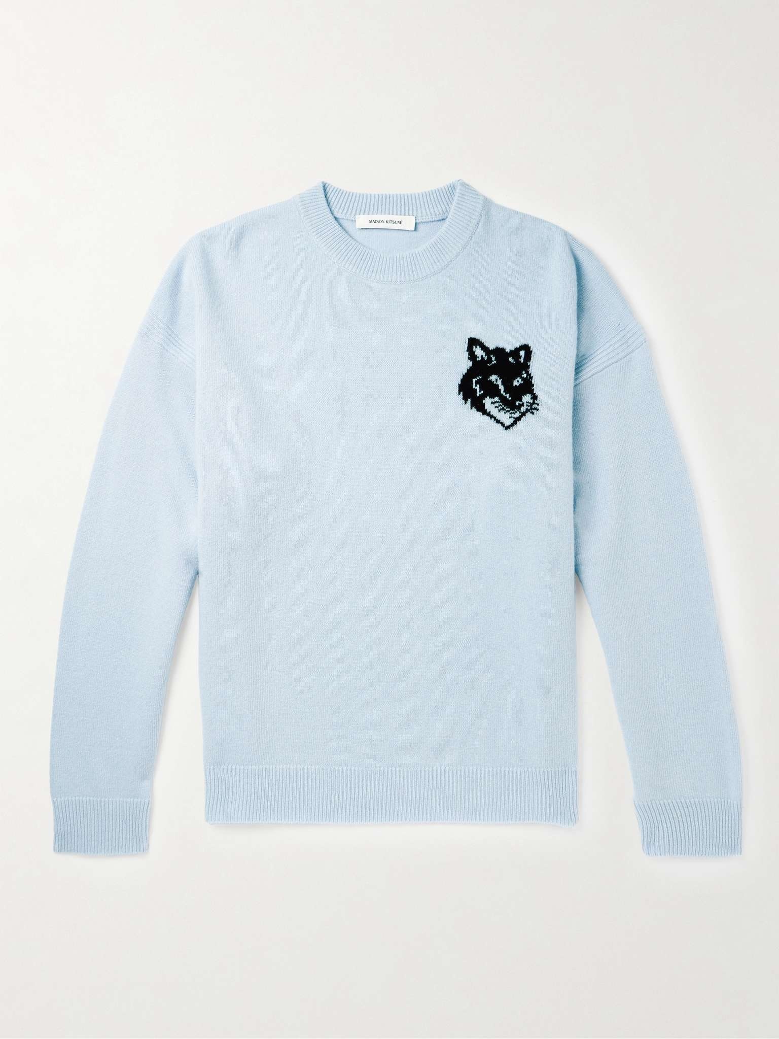 In Japanese folklore, the fox or 'Kitsuné' has the ability to adapt and change its appearance – that's why versatility is key for Maison Kitsune. This sweater is intarsia-knitted from soft, insulating wool and detailed with the recognisable mascot. Size & Fit - Fits true to size. Take your normal size - Those with broad shoulders may wish to take the next size up - Designed for a regular fit - Mid-weight knit - S/M/L sizing Details & Care - Sky-blue and black wool - 100% wool - Dry clean - This item has been imported