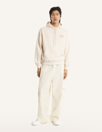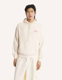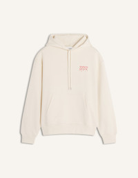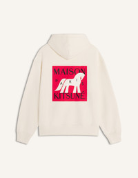 DETAILS Comfort hoodie in cotton fleece. Year of the Horse print on the chest and back. - Hoodie in casual cotton fleece (440g) - Comfort fit - Hooded collar, with drawstrings finished-off with Maison Kitsune engraved metal cord-ends - Kangaroo pocket - Maison Kitsune Paris print on the chest - Year of the Horse large print at the back - Rib finishing at the cuffs and bottom QM070CLKM0341-0063 SIZE & CUT Cut: COMFORT Sizing: MEN The male model is 6 tall and wears a size S MATERIAL Main Material: 100% ORGANIC COTTON, RIB: 2% ELASTANE, 98% ORGANIC COTTON TRACEABILITY Made in Portugal