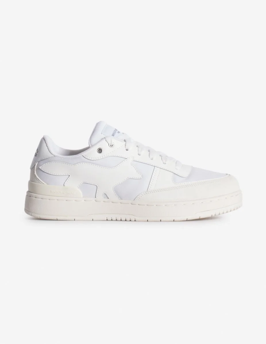 DETAILS Chiru trainers in leather. Sporty model with emblematic Maison Kitsune signatures. - Chiru leather trainers - Smooth leather and canvas - Round toe - Lace-up closure - Lace finishes with Maison Kitsune Handwriting signature print - Maison Kitsune logo woven label on the tongue - Topstitched leather Profile Fox on the sides - Maison Kitsune logo in relief on the side - Maison Kitsune Handwriting signature patch embossed at the back - Rubber outsole - Technical fabric lining and insole MM04804WQ1101-P100 SIZE & CUT Sizing: MEN The male model is 6.1 and is wearing size 45 MATERIAL Upper: 42% BOVINE LEATHER, 44% COTTON, 14% POLYESTER, Lining: 100% POLYESTER, Outsole: 100% RUBBER TRACEABILITY Made in China