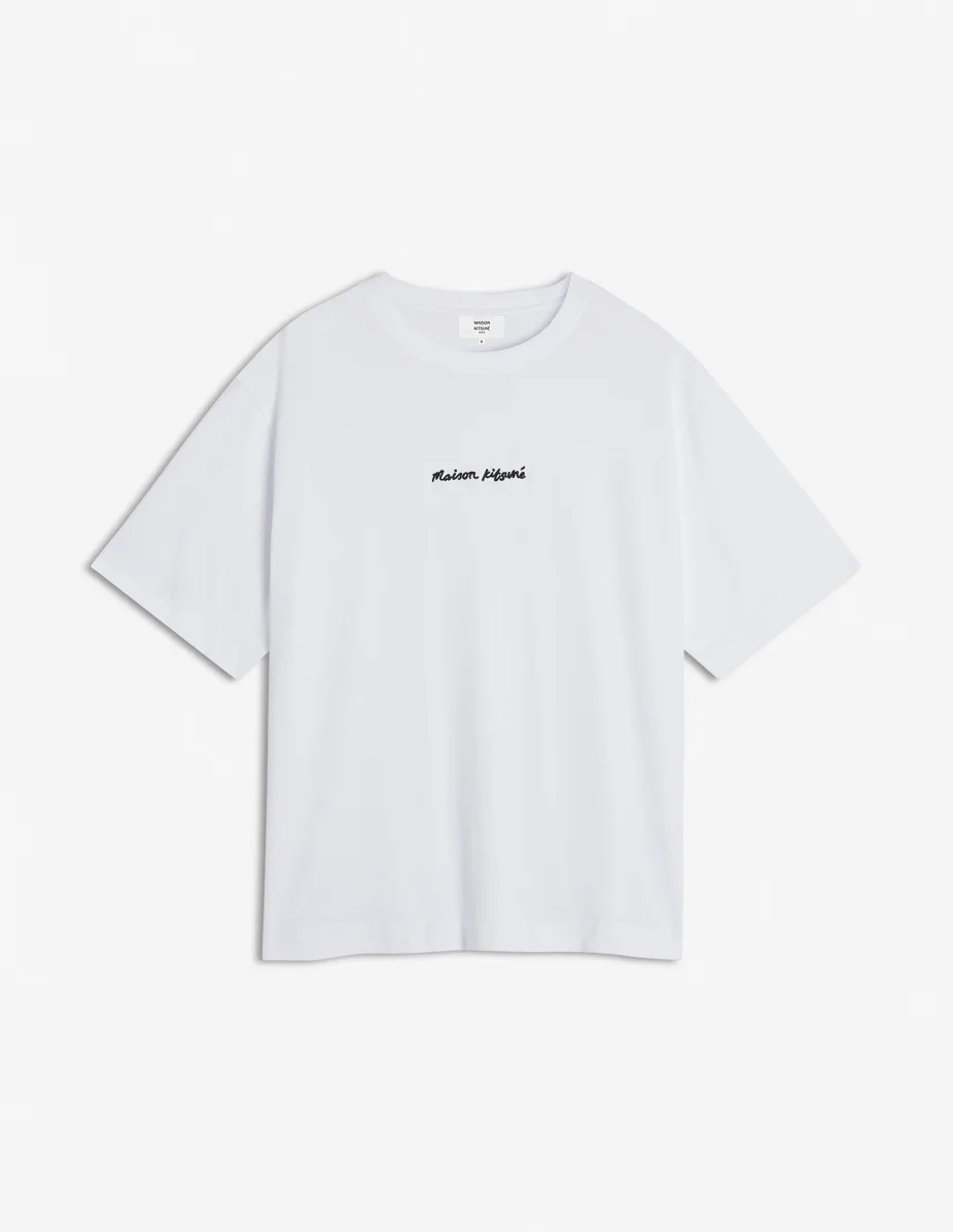 DETAILS T-shirt in cotton jersey (240g) with short sleeves. Oversize fit with Maison Kitsune Handwriting signature embroidered. - T-shirt in cotton jersey (240g) - Organic cotton - Oversize fit - Short sleeves - Crew neck with rib finishing - Maison Kitsune Handwriting signature embroidered on the chest OM00122KJ0119-P100 SIZE & CUT Cut: OVERSIZE Sizing: MEN The male model is 6.1 and is wearing size M MATERIAL 100% COTTON TRACEABILITY Made in Portugal