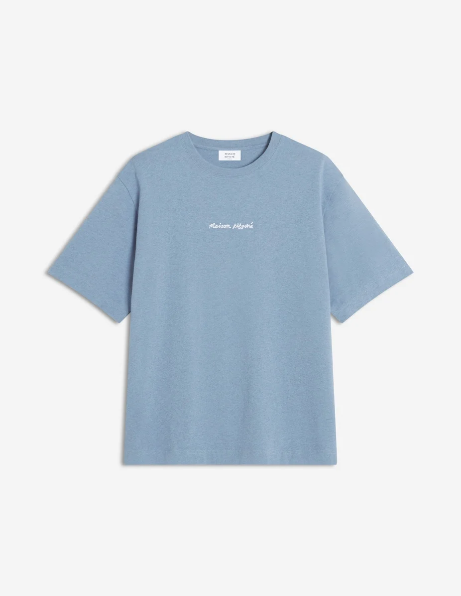 DETAILS T-shirt in cotton jersey (240g) with short sleeves. Oversize fit with "Maison Kitsune Handwriting" signature embroidered. - T-shirt in cotton jersey (240g) - Organic cotton - Oversize fit - Short sleeves - Crew neck with rib finishing - Maison Kitsune Handwriting signature embroidered at the front OM00122KJ0119-0331 SIZE & CUT Cut: OVERSIZE Sizing: MEN The male model is 6.1 and is wearing size M MATERIAL 100% COTTON TRACEABILITY Made in Portugal