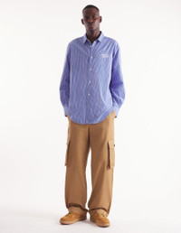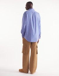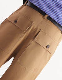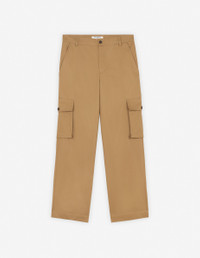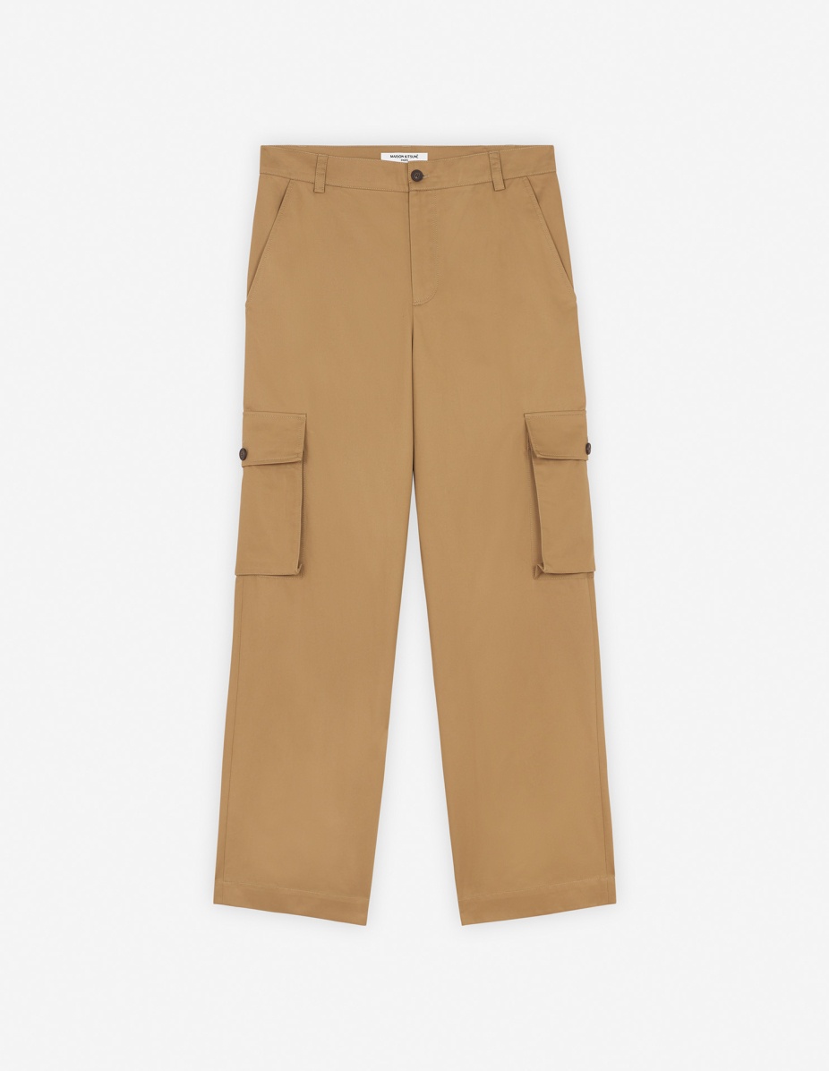 DETAILS Cotton gabardine cargo pants. Relaxed fit with "Maison Kitsune Handwriting" signature embroidered on the back pocket. - Plain cotton gabardine cargo pants - Relaxed fit - Belt loops at the waistband - Button closure with hidden zipper - Two slash side pockets - Two gusset side pockets with button flaps - Two patch back pockets with button flaps - Tonal embroidered "Maison Kitsune Handwriting" signature on the back pocket NM01122WW0078-P245 SIZE & CUT Cut: RELAXED Sizing: MEN MATERIAL Main Material: 100% COTTON, Pocket lining: 100% COTTON TRACEABILITY Made in Romania