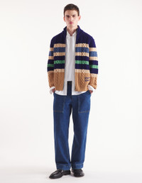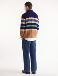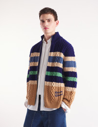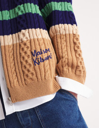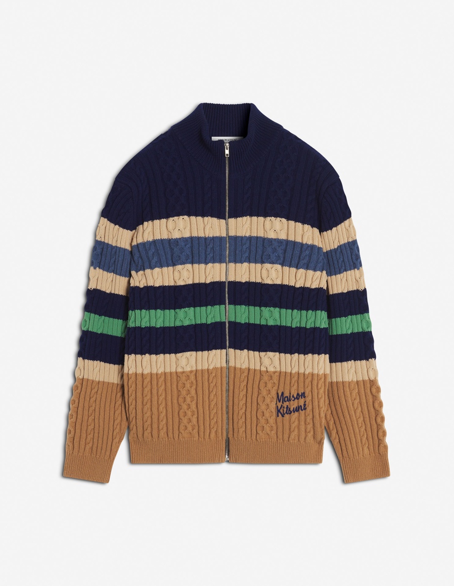 DETAILS Zipped striped cable knit cardigan. Comfort fit with "Maison Kitsune Handwriting" signature on the chest. - Striped cable knit cardigan - Comfort fit - High collar - Visible front zipper closure with Profile Fox engraved slider - Long sleeves - Ribbing at the neckline, cuffs, and waist - Embroidered "Maison Kitsune Handwriting" signature on the chest NM00505KH0001-0034 SIZE & CUT Cut: COMFORT Sizing: MEN MATERIAL 12% POLYAMIDE, 88% WOOL TRACEABILITY Made in Portugal