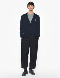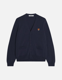 DETAILS Extra-fine merino wool V-neck cardigan. Regular fit with embroidered Fox Head patch. - Extra-fine merino wool cardigan - Regular fit - V neck - Long sleeves - Maison Kitsune engraved button closure - Ribbing at the neckline, cuffs and waist - Fine gauge knit - Fox Head embroidered patch on the chest PM00501KT1181-0413 SIZE & CUT Cut: REGULAR Sizing: MEN The male model is 6.1 and is wearing size M MATERIAL 100% WOOL TRACEABILITY Made in Morocco