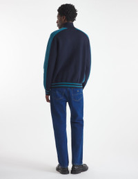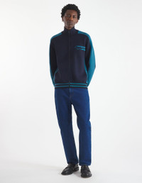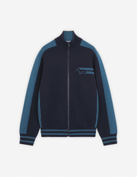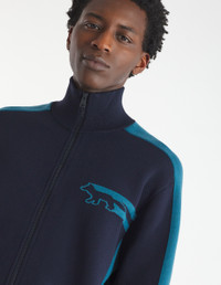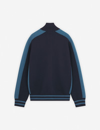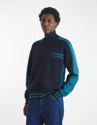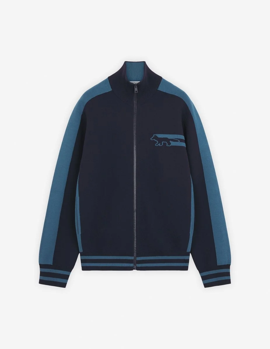 DETAILS Zipped technical knit cardigan with long sleeves. Regular fit with intarsia Flash Fox on the chest. - Bicolor technical knit cardigan - Regular fit - High collar - Visible front zipper closure with Profile Fox engraved slider - Long sleeves - Ribbing at the neckline, cuffs, and waist - Contrast intarsia Flash Fox on the chest NM00503KM0327-P446 SIZE & CUT Sizing: MEN The male model is 6.1 and is wearing size 44 MATERIAL 55% COTTON, 45% POLYAMIDE TRACEABILITY Made in China