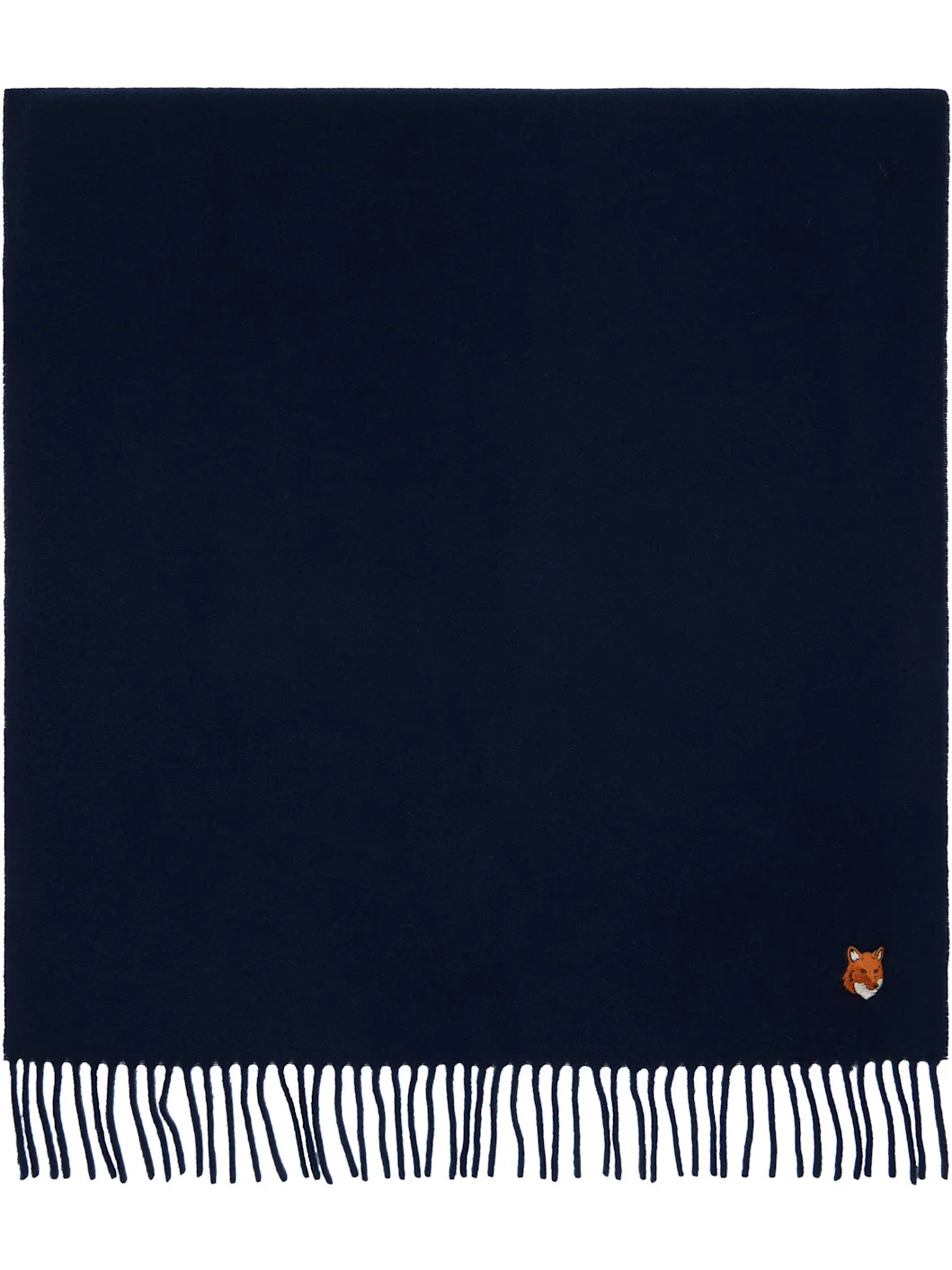 Rectangular and double-faced woven virgin wool scarf. · Embroidered logo patch at end · Fringed detailing at ends · L78" x W23" Supplier color: French navy 100% virgin wool. Made in Italy 252389M150001