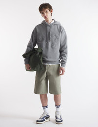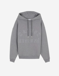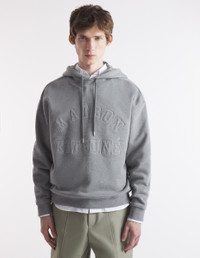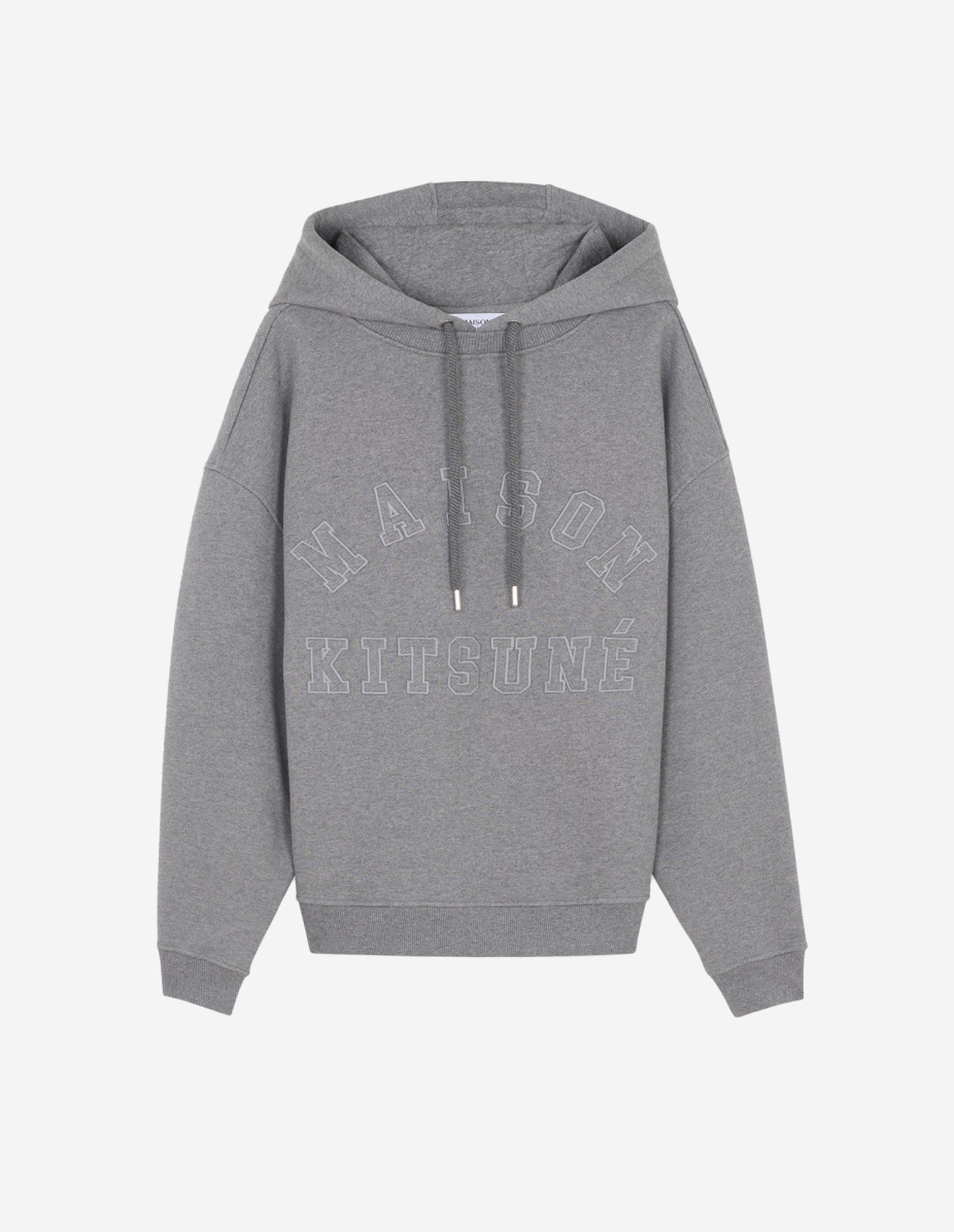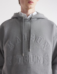 DETAILS Long sleeve textured fleece hoodie. Oversized fit with varsity-style “Maison Kitsune” logo embroidered at the front. - Textured fleece hoodie '- Oversized fit - Crewneck - Drawstring hood - Metal trim on drawstring and eyelets - Long sleeves - Ribbing at the neckline, cuffs, and waist - Varsity-style “Maison Kitsune” logo at the front - Plain back NM00702KM0326-H131 SIZE & CUT Cut: OVERSIZE Sizing: MEN The male model is 6 and is wearing size M MATERIAL 100% COTTON TRACEABILITY Made in Portugal