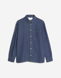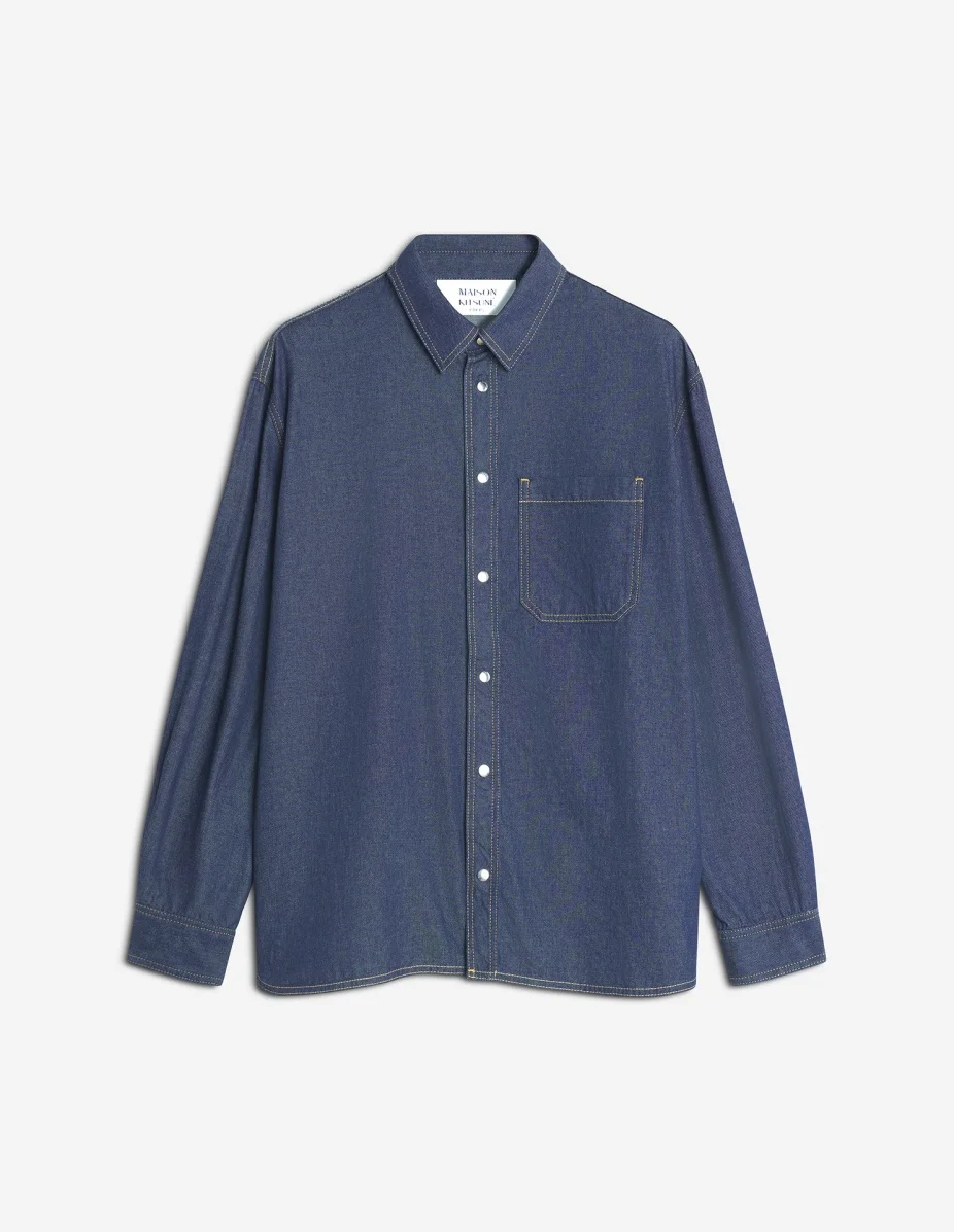DETAILS Light Japanese denim shirt. Oversize fit, contrasted topstitching. - Lightweight denim shirt - Oversize fit - Classic collar - Maison Kitsune engraved snap button closure - Patch chest pocket - Contrasted topstitching - Long sleeves with straight buttoned cuffs - Rounded hem PM00402WD4016-P470 SIZE & CUT Cut: OVERSIZE Sizing: MEN The male model is 6.1 and is wearing size M MATERIAL 100% COTTON TRACEABILITY Made in Italy