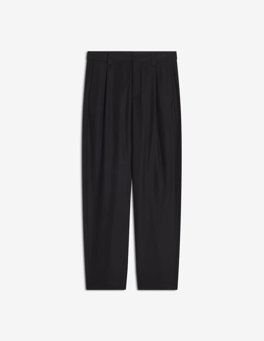DETAILS Pleated trousers in recycled wool flannel. Relaxed fit with embroidered Maison Kitsune Handwriting signature. - Pleated trousers in recycled wool flannel - Relaxed fit - Fitted waistband with belt loops - Hook-and-eye, inner button and covered zip fly fastening - Two front pleats - Two side slant pockets and two back welt pockets - Tonal Maison Kitsune Handwriting signature embroidered on the back pocket PM01102WT3017-P199 SIZE & CUT Cut: RELAXED Sizing: MEN The male model is 6.1 and is wearing size 40 MATERIAL Main Material: 100% WOOL, Body Lining: 49% COTTON, 51% VISCOSE, Pocket lining: 100% COTTON TRACEABILITY Made in Romania
