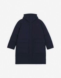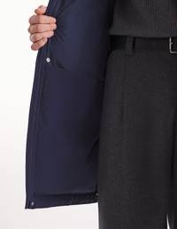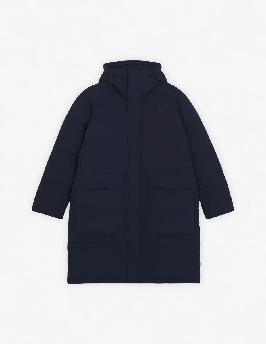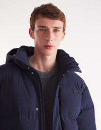 DETAILS Hooded puffer jacket in technical material. Long fit with silicon Fox Head patch on the chest. - Hooded puffer jacket in plain technical material - Long - High collar - Adjustable drawstring hood with stoppers - Hidden zipper and snap closure - Double Profile Fox engraved sliders - Interior drawstring waist with stoppers - Long sleeves - Ribbed cuffs - Two double patch pockets with flaps on the sides - Tonal silicon Fox Head patch on the chest - Tonal lining - Interior patch pocket with Velcro NM02207WQ4031-P480 SIZE & CUT Cut: LONG Sizing: MEN MATERIAL Main Material: 100% POLYESTER, Stuffing material: 10% FEATHER, 90% DUCK DOWN, Lining: 100% POLYESTER TRACEABILITY Made in China