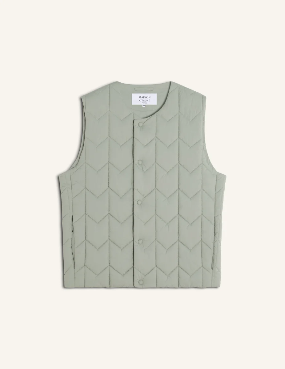 DETAILS Quilted vest in water repellent quilted nylon. Straight fit with Maison Kitsune Paris silicone patch at the back neckline. - Sleeveless jacket in water repellent quilted nylon vest - Bespoke Chevron Fox quilting - Straight fit - Crew neck - Snap button closure with Maison Kitsune engraved buttons - Maison Kitsune Paris silicon patch at the back neckline QM02107WW9067-0437 SIZE & CUT Cut: STRAIGHT Sizing: MEN The male model is 6 tall and wears a size S MATERIAL Main Material: 100% POLYAMIDE, Stuffing material: 100% POLYESTER, Lining: 100% POLYAMIDE TRACEABILITY Made in China