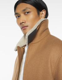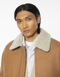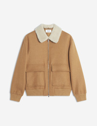 DETAILS Recycled wool blouson with removable shearling collar. - Recycled wool jacket - Comfort fit - Removable shearling collar - Two front flap patch pockets - Double zip closure with Profile fox-engraved sliders - Maison Kitsune interior chain at the neckline PM02140WM2030-0299 SIZE & CUT Cut: COMFORT Sizing: MEN The male model is 6.1 and is wearing size M MATERIAL Main Material: 100% WOOL, COLLAR LINING: 100% VISCOSE, Collar: 100% SHEARLING, COLLAR YOKE: 100% LAMB LEATHER, RIB: 2% ELASTANE, 8% POLYAMIDE, 45% ACRYLIQUE, 45% WOOL, Lining: 100% VISCOSE TRACEABILITY Made in Bulgaria
