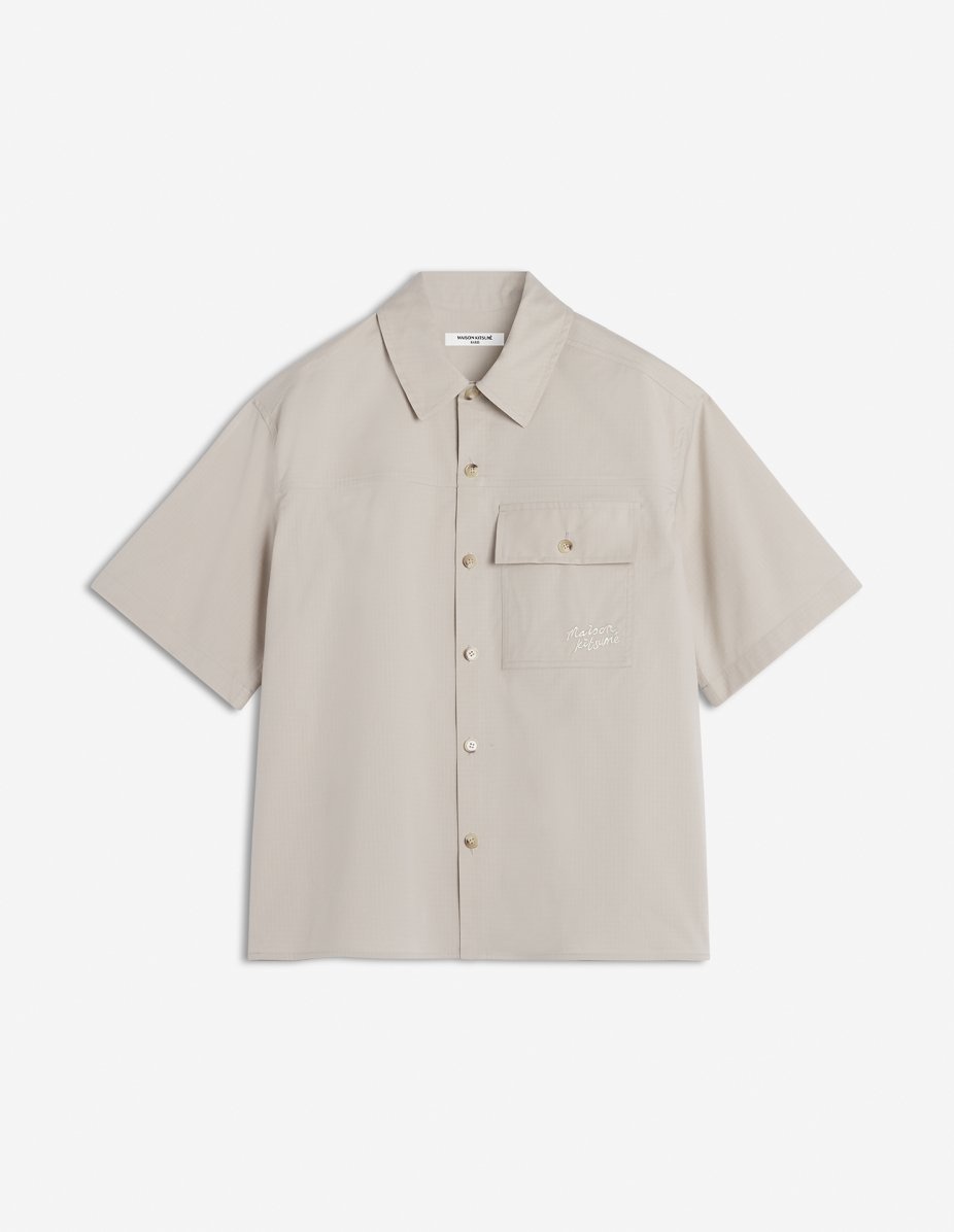 DETAILS Short sleeve shirt in cotton ripstop. Boxy cut with Maison Kitsune Handwriting signature embroidered. - Cotton ripstop shirt - Boxy cut - Shirt collar - Button closure - Patch chest pocket with button flaps - Maison Kitsune Handwriting signature embroidered on the pocket - Short sleeves OM00429WW9020-0119 SIZE & CUT Cut: BOXY Sizing: MEN The male model is 11 and is wearing size M MATERIAL 67% COTTON, 33% POLYESTER TRACEABILITY Made in Portugal