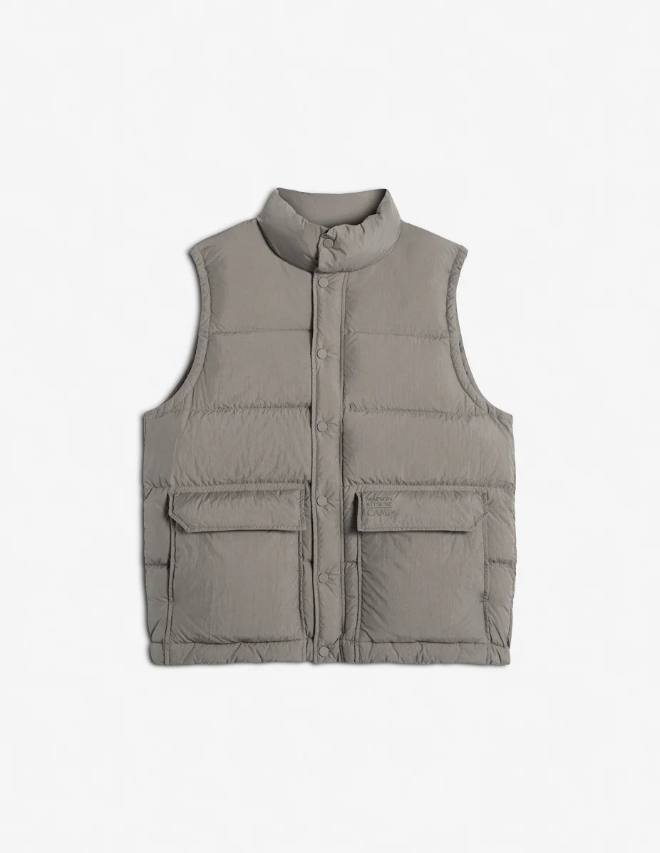 DETAILS Sleeveless lightweight nylon puffer jacket. Comfort fit and Maison Kitsune Camp signature. - Lightweight quilted sleeveless vest in nylon - Comfort fit - Down padding - Hidden zip fastening under snap placket - Two front patch pockets with flaps - Maison Kitsune Camp signature printed on the front pocket and back PM02231WQ4070-0301 SIZE & CUT Cut: COMFORT Sizing: MEN The male model is 6.1 and is wearing size M MATERIAL Main Material: 100% POLYAMIDE, Stuffing material: 90% DUCK DOWN, 10% DUCK FEATHER, Lining: 100% POLYAMIDE TRACEABILITY Made in China