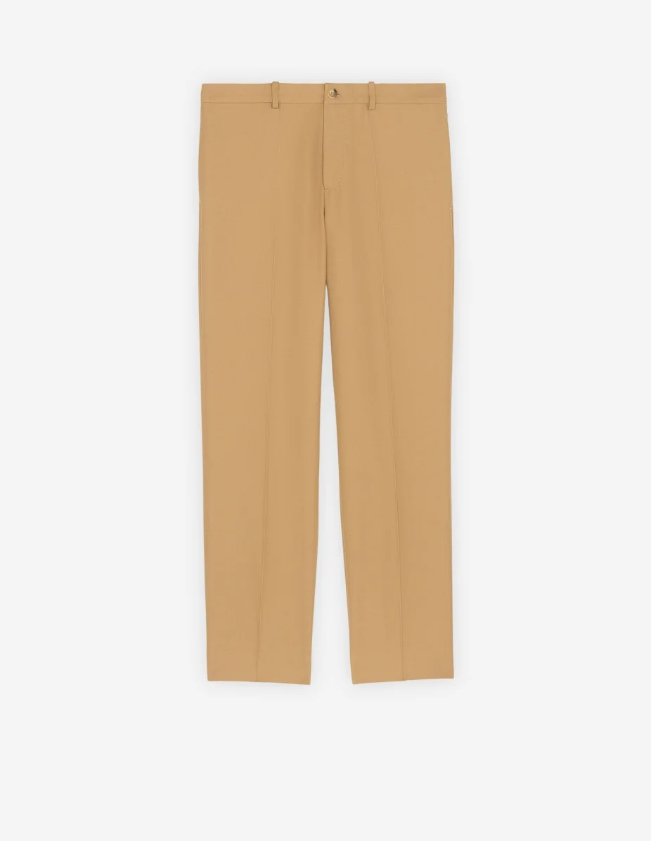 DETAILS Wool grain de poudre suit pants. Straight| elegant cut. - Wool grain de poudre pants - Straight cut - Button closure with hidden zipper - Belt loops at waistband - Two welt back pockets - Tonal embroidered “Maison Kitsune” at the back JM01181WT0020-P220 SIZE & CUT Cut: CLASSIC Sizing: MEN MATERIAL Main Material: 55% POLYESTER, 45% VIRGIN WOOL, Lining: 100% COTTON TRACEABILITY Made in Romania