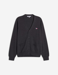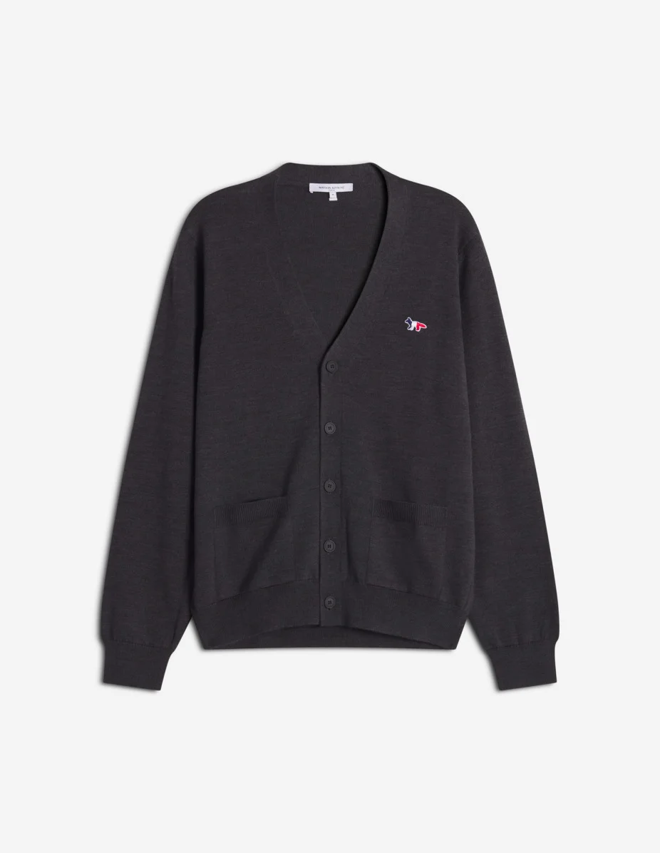 DETAILS Extra-fine merino wool V-neck cardigan. Regular fit with embroidered Tricolor Fox patch. - Extra-fine merino wool cardigan - Regular fit - V neck - Long sleeves - Maison Kitsune engraved button closure - Ribbing at the neckline, cuffs and waist - Fine gauge knit - Tricolor Fox embroidered patch on the chest PM00511KT1036-H190 SIZE & CUT Cut: REGULAR Sizing: MEN MATERIAL 100% WOOL TRACEABILITY Made in Morocco