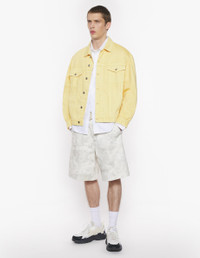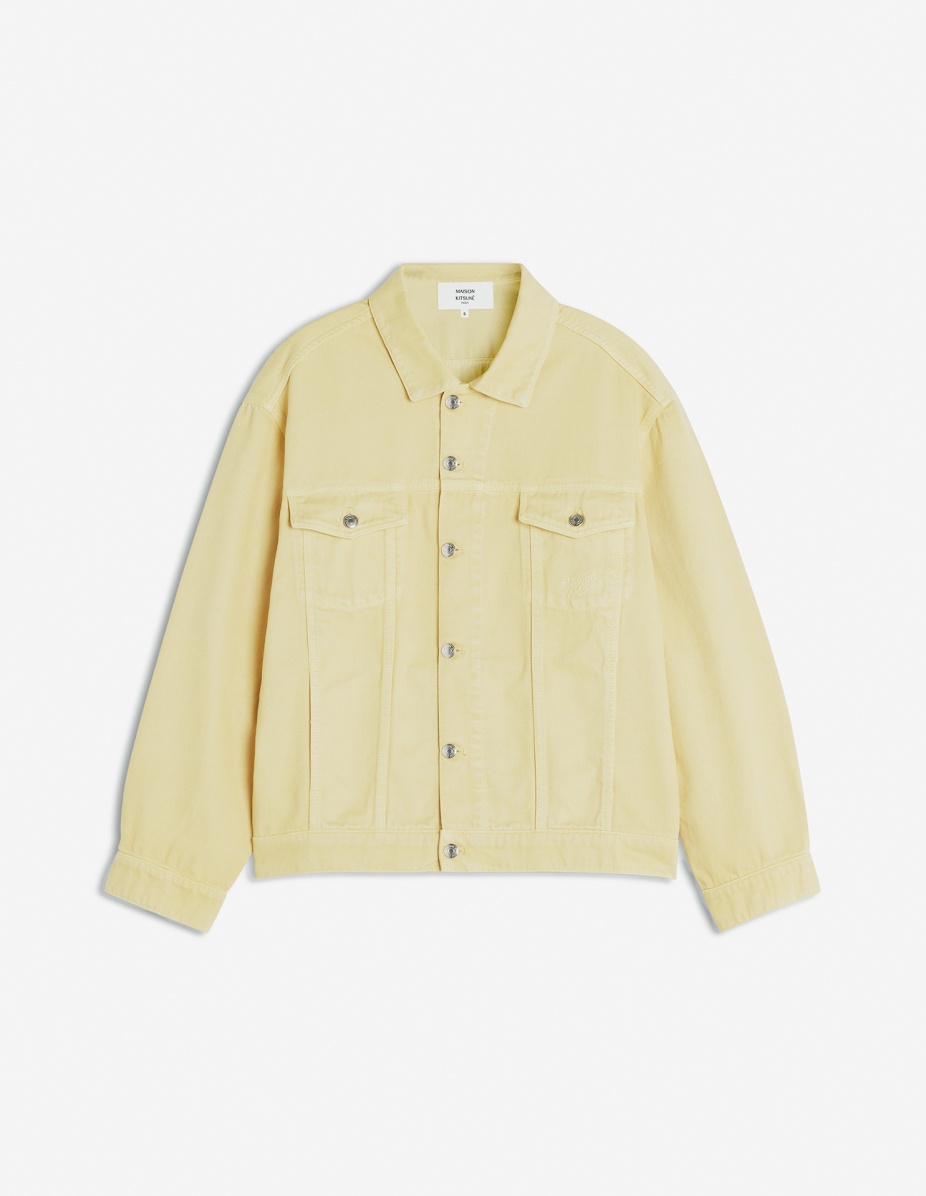 DETAILS Trucker jacket in overdyed denim. Relaxed cut with Maison Kitsune Handwriting signature embroidery and Profile Fox embossed jacron. - Overdyed denim trucker jacket - Relaxed cut - Shirt collar - Closure with engraved metal buttons - Two patch pockets with button flaps on the chest - Tone-on-tone Maison Kitsune Handwriting signature embroidery on the chest pocket - Long sleeves finished off with straight button cuffs - Waistband with button tabs on the sides - Profile Fox embossed jacron at the back waist OM02103WD4012-0084 SIZE & CUT Cut: RELAXED Sizing: MEN The male model is 11 and is wearing size M MATERIAL Main Material: 100% COTTON, Pocket lining: 100% COTTON TRACEABILITY Made in Tunisia
