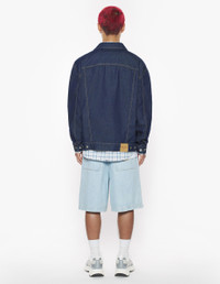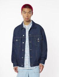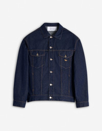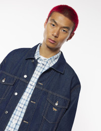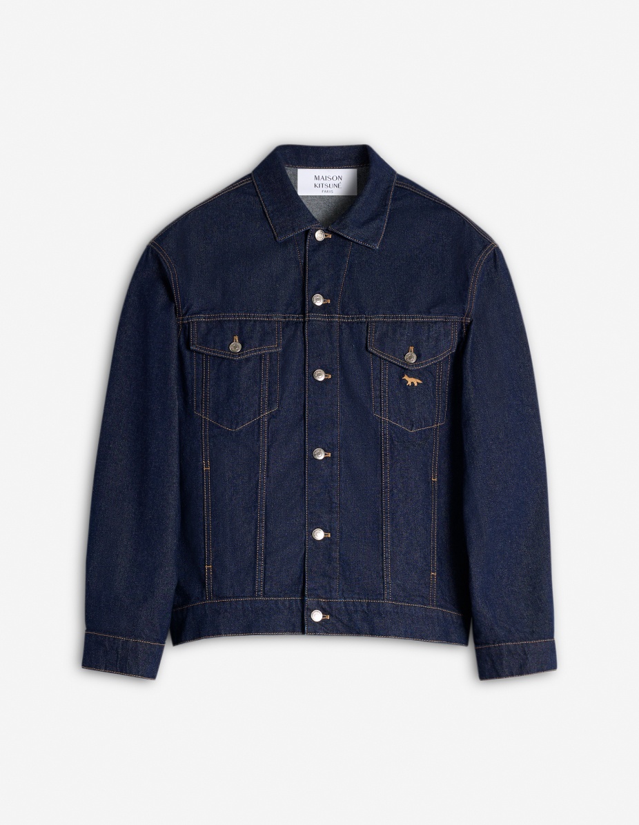 DETAILS Trucker jacket in Japanese denim. Relaxed cut with Profile Fox embroidery and Maison Kitsune embossed jacron. - Japanese denim trucker jacket with contrasted topstitching - Relaxed cut - Shirt collar - Closure with engraved metal buttons - Two pockets with button flaps on the chest - Long sleeves finished off with straight button cuffs - Contrasted Profile Fox embroidery on the chest pocket - Waistband with button tabs on the sides - Maison Kitsune embossed jacron at the back waist OM02103WW0081-P470 SIZE & CUT Cut: RELAXED Sizing: MEN The male model is 9.5 and is wearing size M MATERIAL Main Material: 100% COTTON, Pocket lining: 20% COTTON, 80% POLYESTER TRACEABILITY Made in Bulgaria