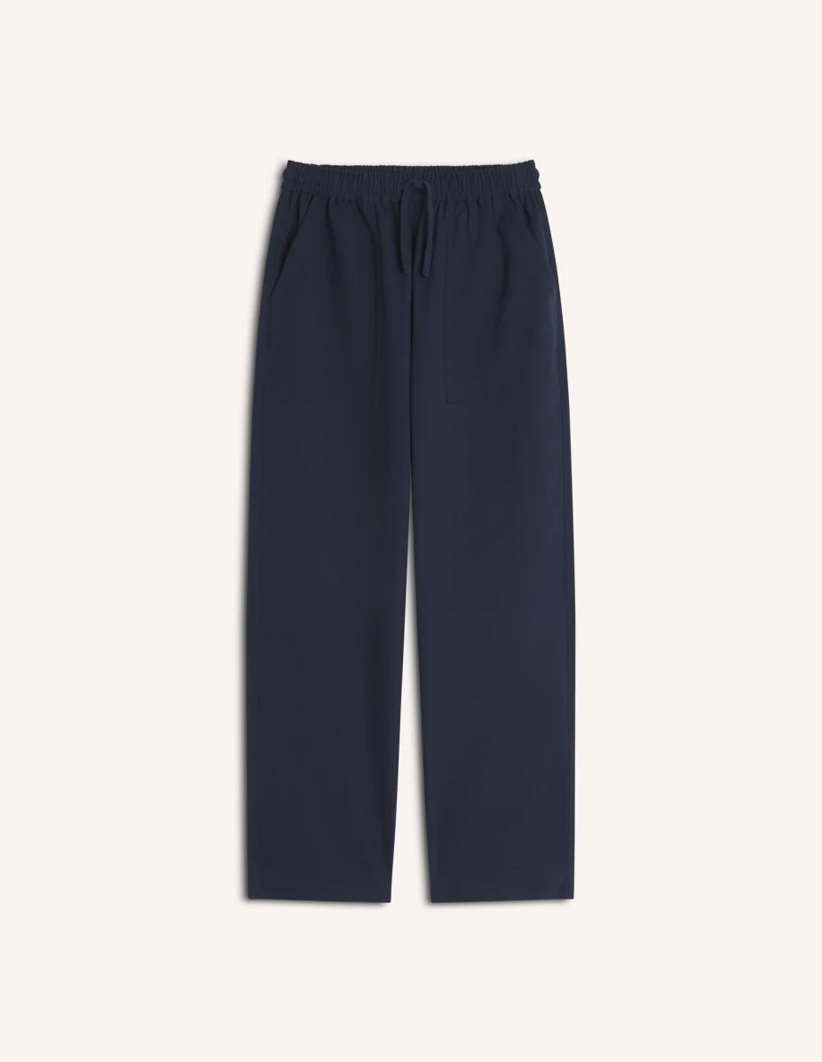 DETAILS Workwear pants in cotton canvas. Relaxed fit with Maison Kitsune Handwriting embroidery. - Cotton canvas workwear pants - Relaxed fit - Elasticated waistband with drawstring - Slant patch pockets at the front - Patch pockets at the back - Maison Kitsune Handwriting embroidery on the back QM01109WW9102-0413 SIZE & CUT Cut: RELAXED Sizing: MEN The male model is 5.9 tall and wears a size S MATERIAL 100% COTTON TRACEABILITY Made in China