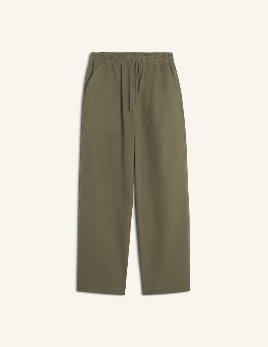 DETAILS Workwear pants in cotton canvas. Relaxed fit with Maison Kitsune Handwriting embroidery. - Cotton canvas workwear pants - Relaxed fit - Elasticated waistband with drawstring - Slant patch pockets at the front - Patch pockets at the back - Maison Kitsune Handwriting embroidery on the back QM01109WW9102-0079 SIZE & CUT Cut: RELAXED Sizing: MEN The male model is 5.9 tall and wears a size S MATERIAL 100% COTTON TRACEABILITY Made in China