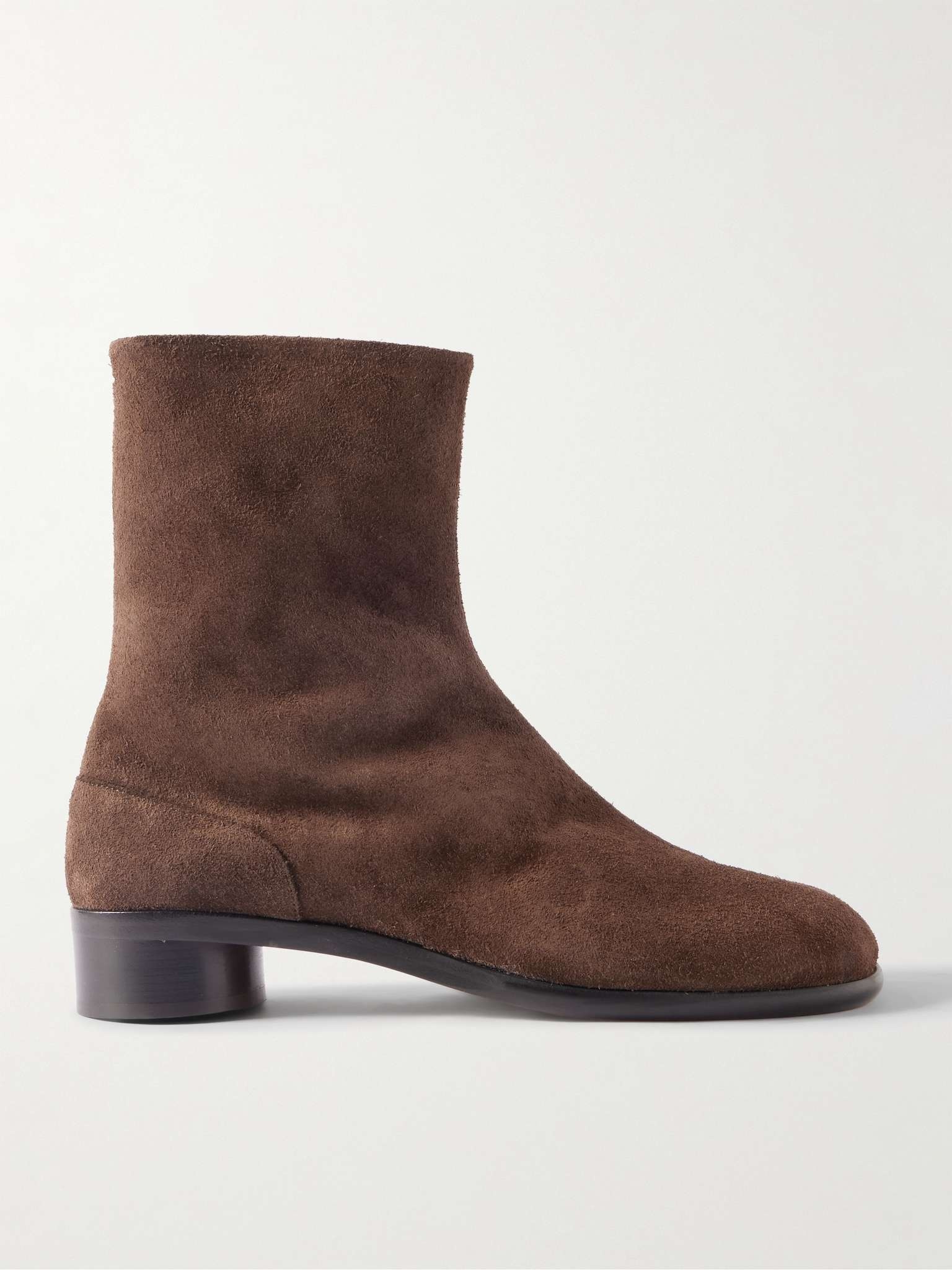 Maison Margiela's 'Tabi' design was introduced in 1989 as part of the house's debut collection and continues to be re-imagined each season. These suede boots feature the iconic split-toe and rest on 3cm cylindrical heels. Hook closures help maintain their structure over time. Size & Fit - Fits true to size. Take your normal size - Narrow at the top of the foot - European sizing Details & Care - Brown suede (Calf) - Hook fastening