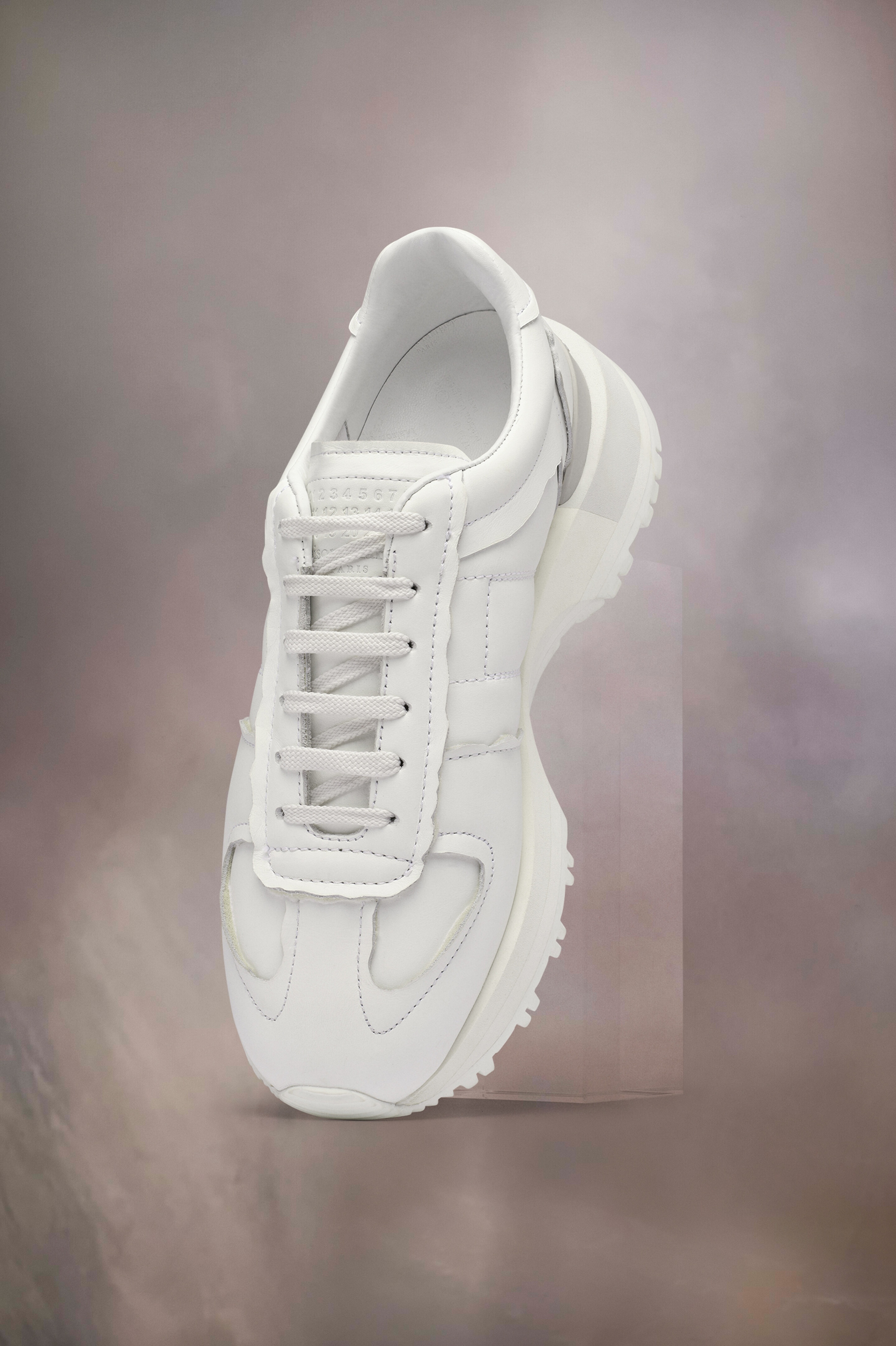 The 50-50 sneakers come in calfskin. They feature a tonal layered sole with the numeric logo on the back – finished with the single white stitch showing the hand of Maison Margiela. Product Details Item ID S57WS0473P5340T1003 Upper: 100% Calf leather Lining: 100% Polyester Contrast: 100% Calf leather Inside: 100% Calf leather Sole: 100% Polyurethane Lace up shoes Décortiqué lasered details Logo label on the tab Logo label at the back White stitching at the back Lightly padded Two-tone assembled sole Internal elastic All-over logo insole Made in Italy