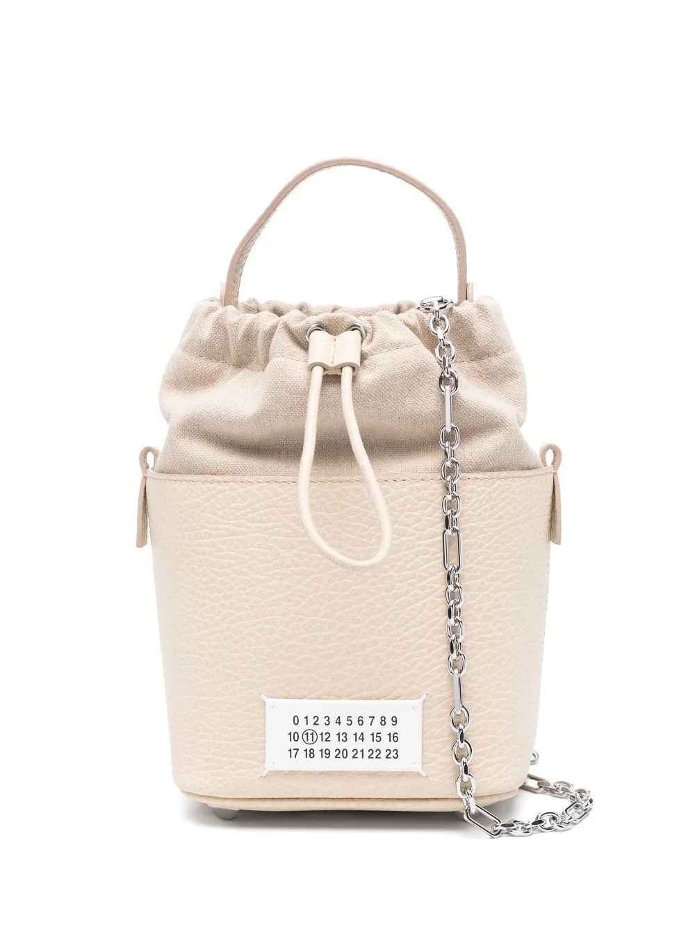 small 5AC bucket bag Highlights - Taupe brown - Top drawstring fastening - Detachable top handles - Detachable leather and chain-link shoulder strap - This piece comes complete with a protective dust bag. Made in Italy Composition Outer: Calf Leather 100%, Cotton 79%, Brass 60%, Zinc 40%, Polyester 15%, Other Fabrics 6% Lining: Cotton 100% SIZE & FIT Model measurements Height 6 ft 2 in(1.87 m) Bust/Chest 37.79 in(96 cm) Hips 37.79 in(96 cm) Waist 30.31 in(77 cm) Measurement DEPTH 4.33 in(11 cm) HEIGHT 5.9 in(15 cm) WIDTH 5.11 in(13 cm)