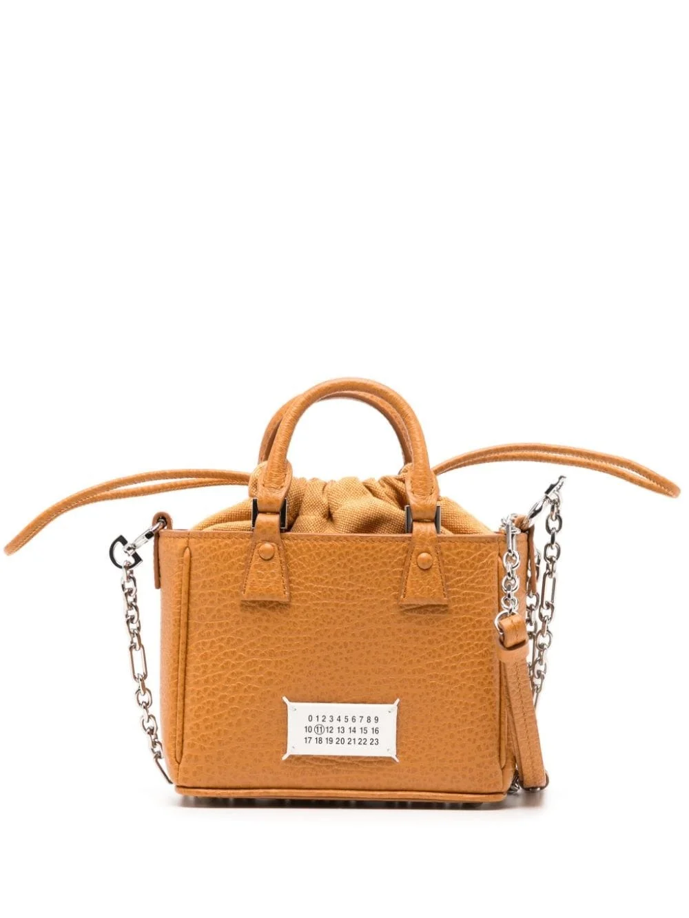 5AC leather shoulder bag Highlights - Carrot orange - Calf leather - Grained texture - Signature numbers motif - Silver-tone hardware - Top drawstring fastening - Detachable chain-link shoulder strap - Two rolled top handles - Main compartment - Internal zip-fastening pocket - Internal logo patch - Metal feet Made in Italy Composition Calf Leather 100% SIZE & FIT Measurement DEPTH 2.75 in(7 cm) HANDLE 1.57 in(4 cm) HEIGHT 4.72 in(12 cm) STRAP 21.25 in(54 cm) WIDTH 6.29 in(16 cm)