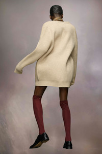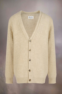 A long-line, buttoned cardigan with a low V-neck and ribbed texture. Maison Margiela's signature, the four white stitches, appear at the back; the opposite of a label. Gauge 5.