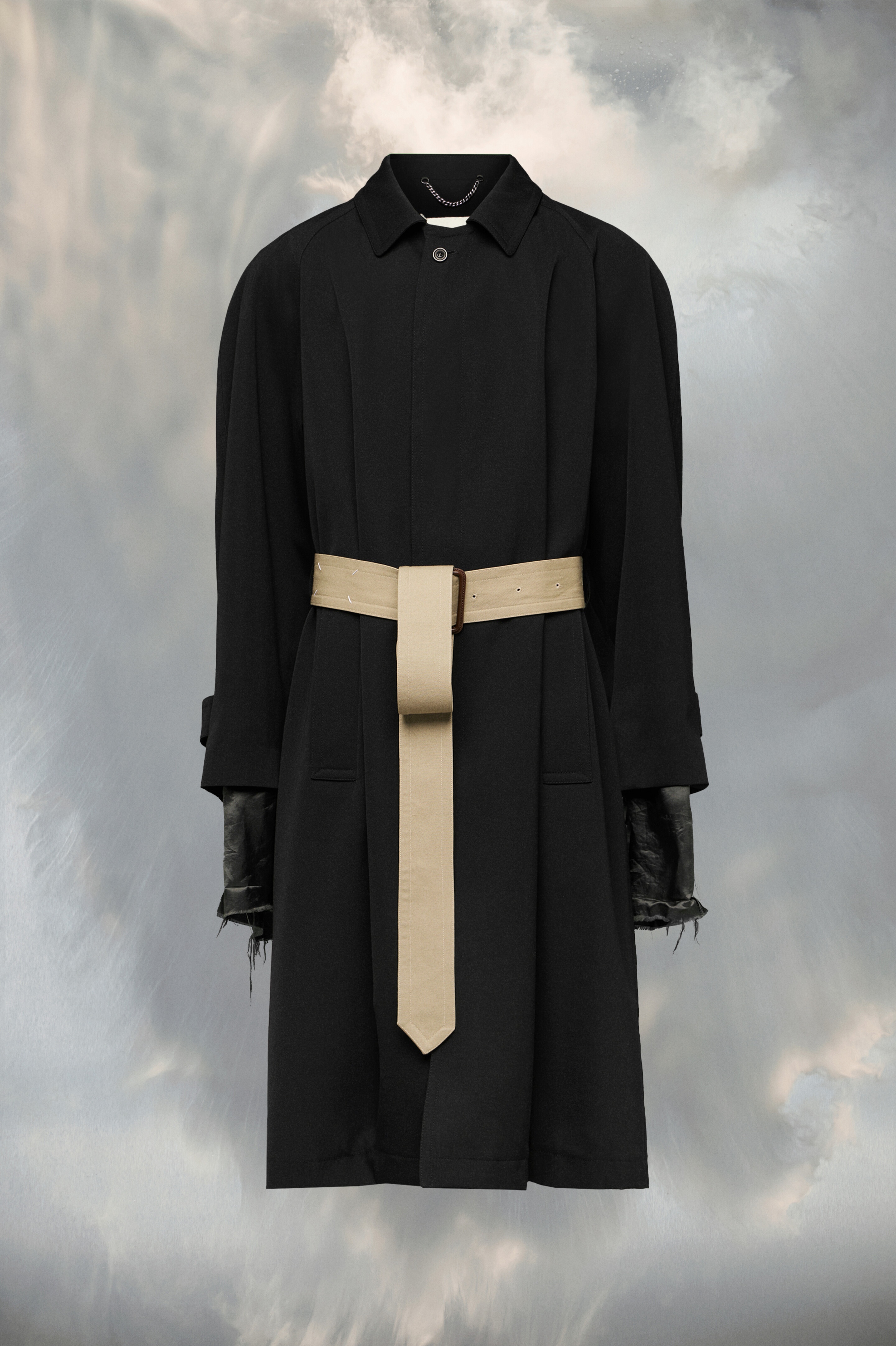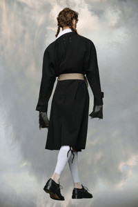 With gestures from the mid-century women's wardrobe, the wool gabardine coat features a concealed single-breasted placket, belted waist and single back vent. It features the play of Anonymity of the lining exposed at the cuffs. Maison Margiela’s signature Four stitches appear at the back; the opposite of a label. Product Details Item ID S67AH0043M35062900 Primary fabric: 100% virgin wool Sleeve lining: 52% acetate, 48% viscose-rayon Pocket lining: 100% cotton Wool gabardine trench coat Concealed single-breasted horn button closure Horn button-tab cuffs D-ring belt with Four stitches Side pockets Backslit Four stitches at the back Made in Italy