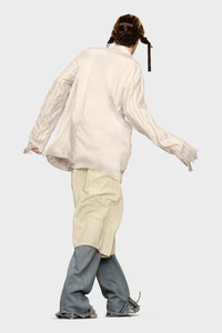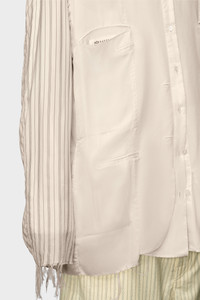 With multi-pockets for a utilitarian aesthetic, the lightweight jacket features a classic collar, buttoned placket and layered hem indicating the Maison's Anonymity of the lining concept. The sleeves come in a contrast stripe. The shirt can be worn reversed with a plain design and striped lining revealed at the cuffs with raw edges. Maison Margiela's signature, the four stitches, appear at the back; the opposite of a label. Product Details Item ID S50BN0532MTN051961 Primary Fabric: 60% Mohair 40% Virgin Wool Secondary Fabric: 55% Viscose-Rayon 45% Cupro Lining: 100% Viscose-Rayon Sleeve Lining: 100% Cotton Pocket Lining: 100% Cotton Mixed fabric jacket Classic collar Contrasting fabric long sleeves Raw-edge hem Welt pockets Front button closure Four stitches at the back Made in Italy Model is 189 cm tall and wears a size 46.