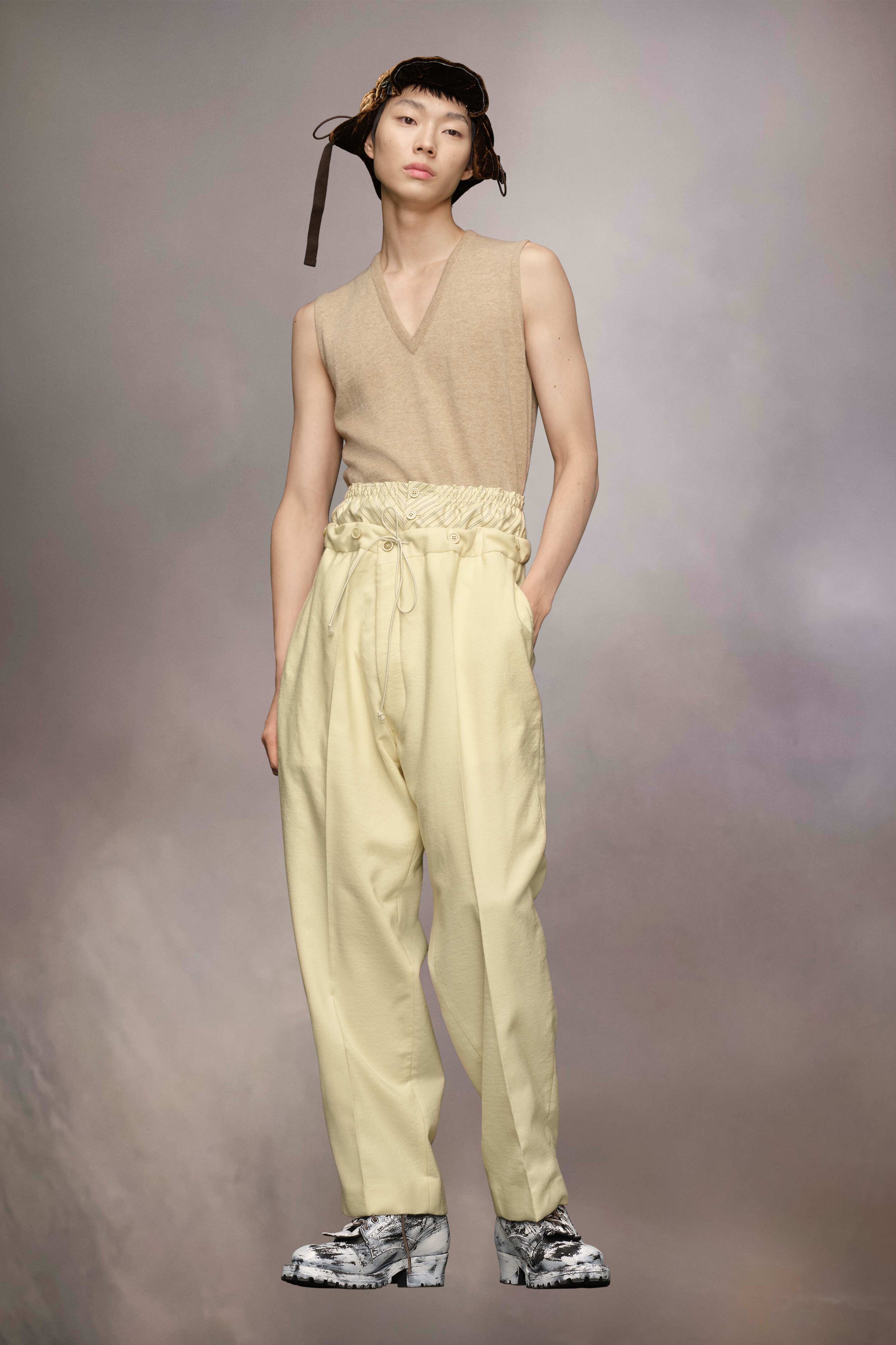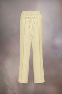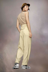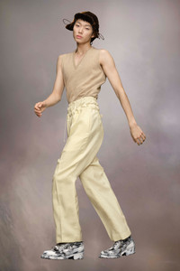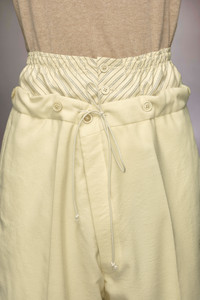 The mohair wool trousers explore the Maison’s Anonymity of the lining concept, with a high-waisted striped inner section reminiscent of traditional underwear. The plain trousers form a second layer and feature buttons around the waistband with a drawstring tie to close. With pleats and pockets, the trousers are also designed with a buckle at the back for an adjustable fit. Maison Margiela's signature, the four stitches, appear at the back; the opposite of a label. Product Details Item ID S50KA0658M35415102 Primary Fabric: 80% Wool 20% Mohair Secondary Fabric: 80% Cotton 20% Polyester Lining: 100% Cotton Lining: 100% Viscose-Rayon Pocket Lining: 100% Cotton Wool mohair trousers Two-layered waist with quilted inner layer with buttons and outer layer with a drawstring Dropped crotch Button fly under the inner waistband Straight-cut at the bottom Adjustable at the back Four stitches at the back Made in Italy Model is 188 cm tall and wears a size 46.